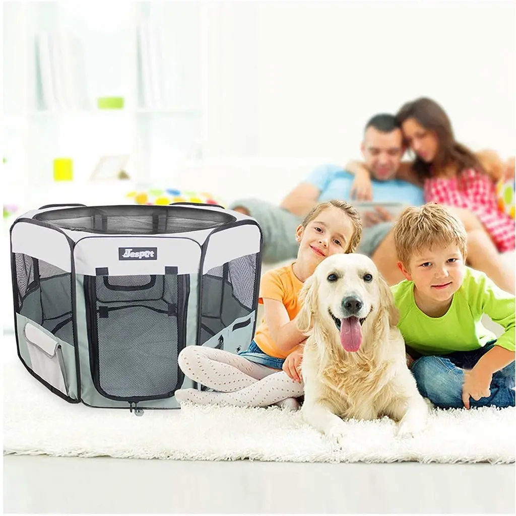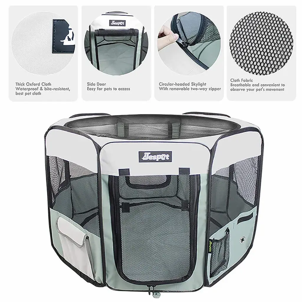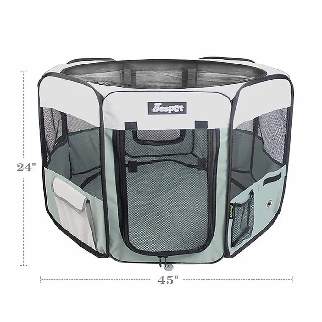 Jespet Soft Side Playpen is ultra-portable design that collapses and sets up in a breeze, this indoor & outdoor playpen allows you to take your pet adventures to go. Two zippered doors give your pet multiple ways to enter and exit their play area while also providing the visibility and ventilation needed to keep them comfortable. 1. Large Roomy: 2 zippered doors for convenient out and in, zippered mesh cover and 8 mesh windows provide plenty of ventilation. 2 side storage to store leash, treats, poop bags. 1 mesh pocket to store water bottle. 2. Superior Design: 8-Panel design with protected seams and reinforced corner. Removable zippered top can be easily removed for indoor and outdoor. Zippered door provides easy in/out access for your pets. 3. Material: Made of durable 600D Oxford fabric and mesh panels, water resistant materials, easy to clean up and comfortable for pets. 4. Portable & Lightweight: Great for Indoor and Outdoor use. Lightweight, yet strong makes this ideal for traveling, camping with convenient carrying case. This easy to assemble playpen requires no tools and easily sets up and folds down within seconds.