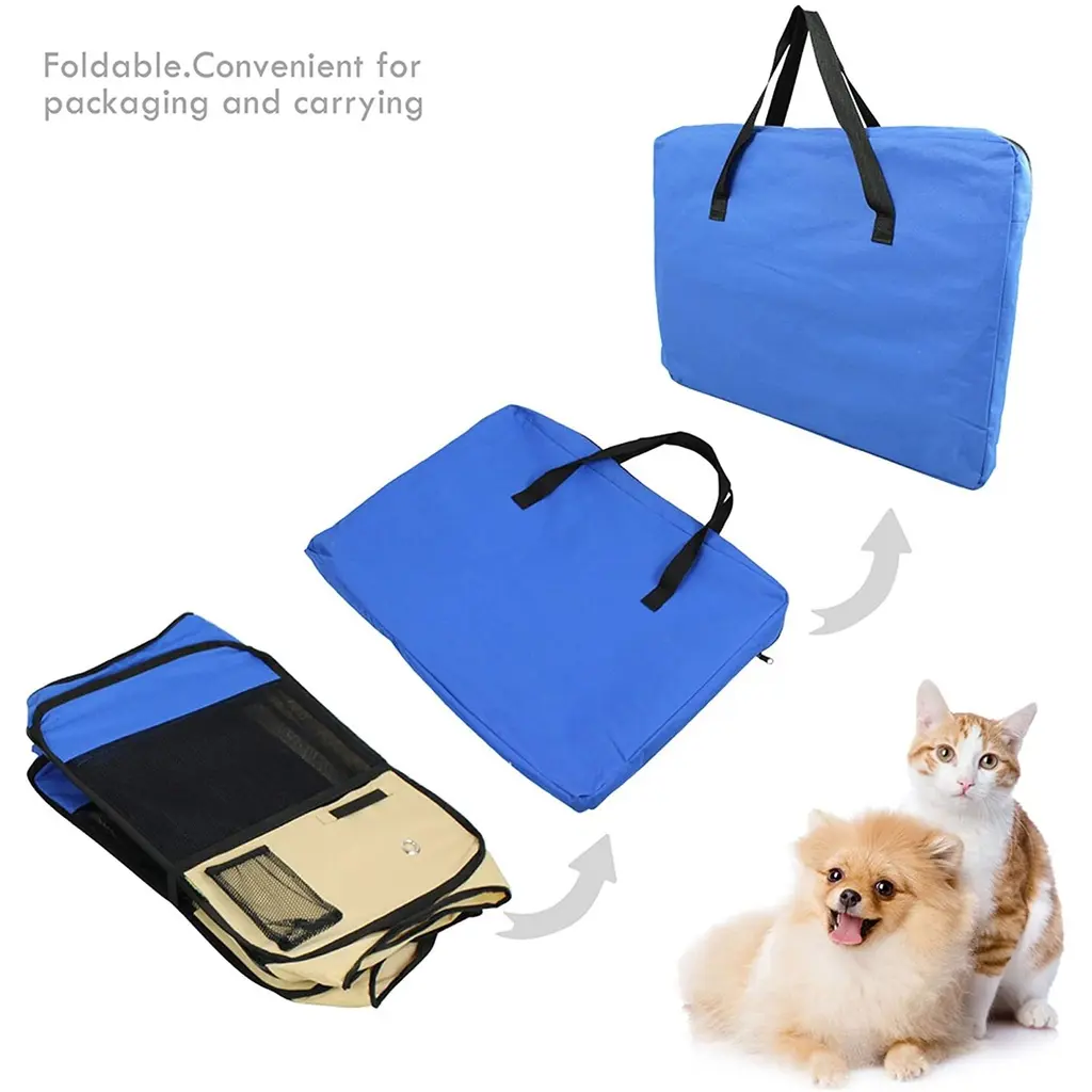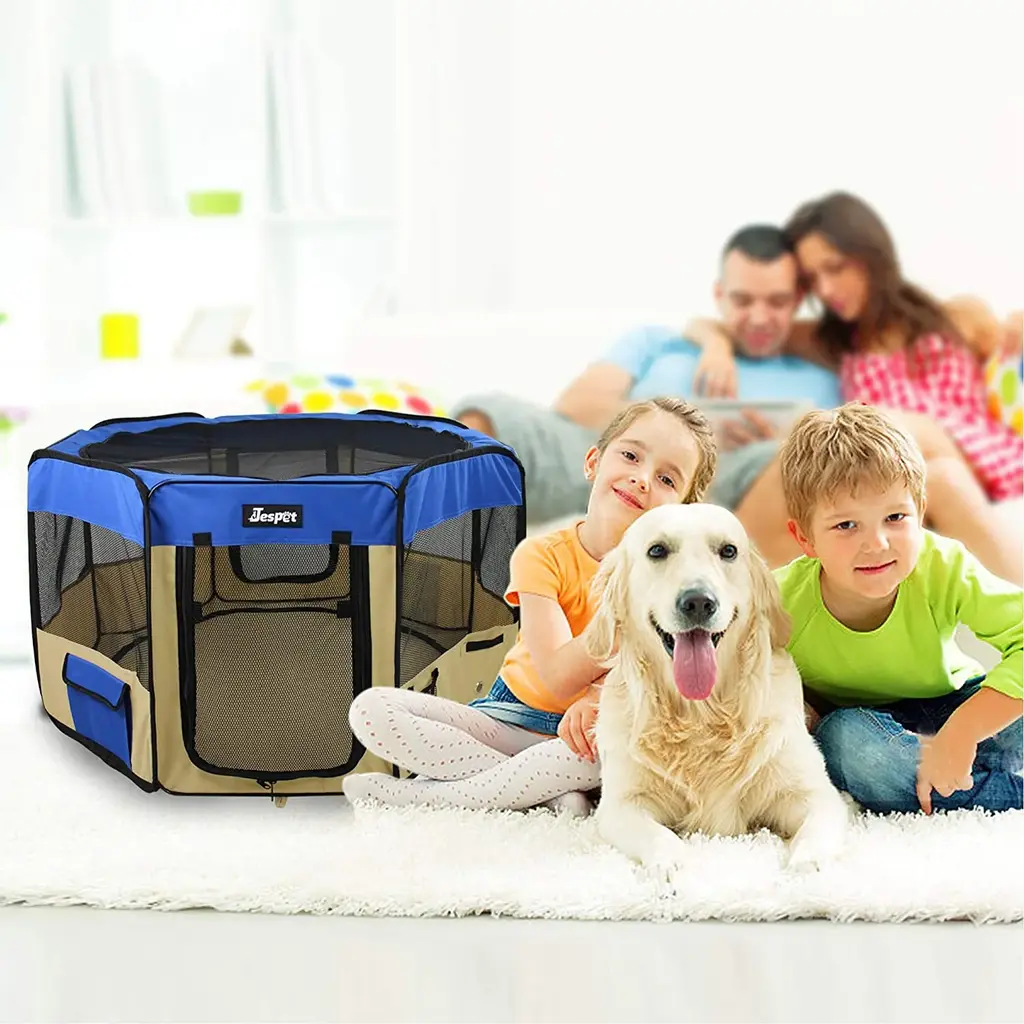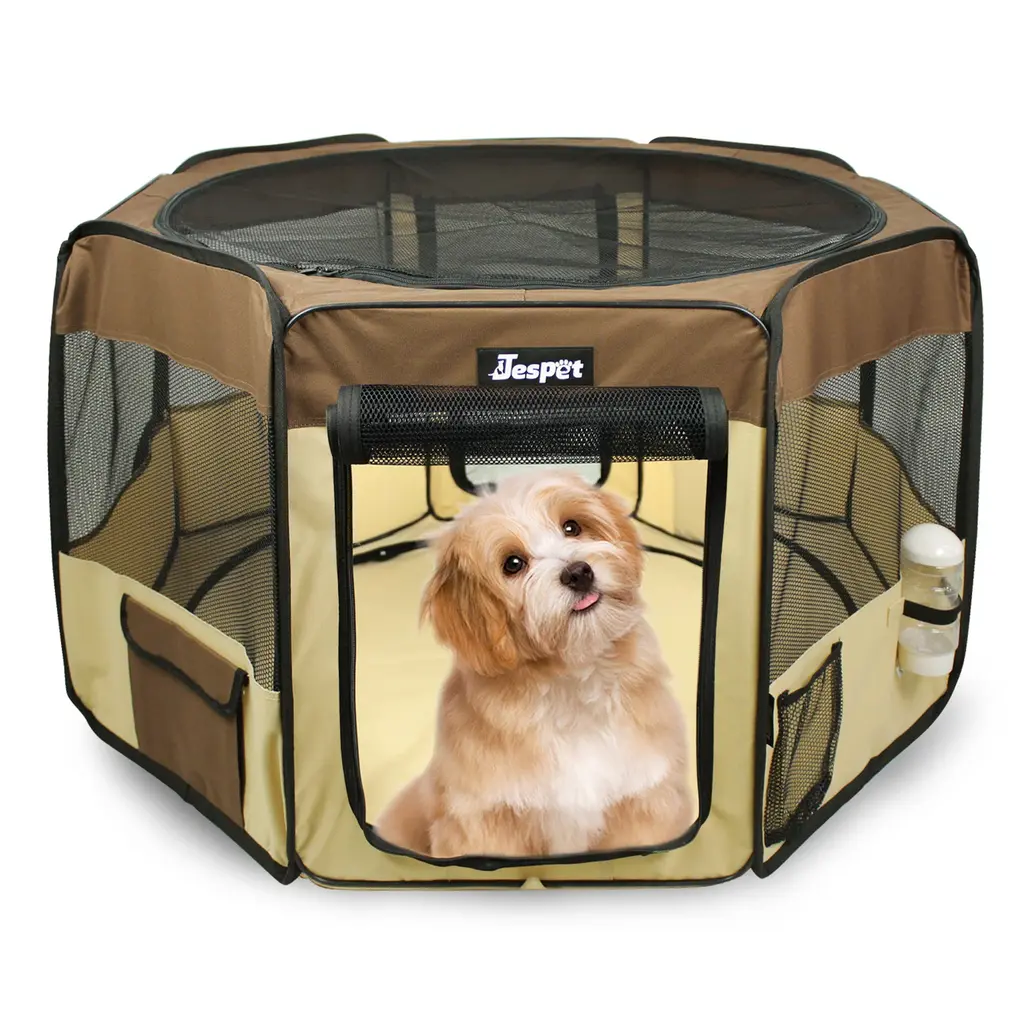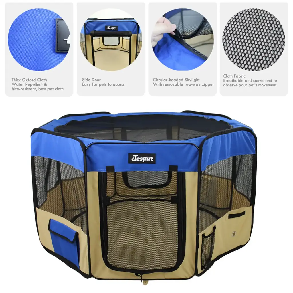 Jespet Soft-Sided Folding Dog & Cat Playpen is used to surround an area, usually outdoors but not always, in which the animals can freely move around. They are commonly used for dogs, such as to give puppies or adult dogs more space than dog crates, but can also be used for cat, rabbits and other animals. 1. Puppy Playpen Approximate Dimensions: 45"(Diameter) x 30" (Height). Please Measure your Pets before purchase. All dimensions are measured manually, please allow deviation of 1 inch. 2.Large Roomy: 2 zippered doors for convenient out and in, zippered mesh cover and 8 mesh windows provide plenty of ventilation. 2 side storage to store leash, treats, poop bags. 1 mesh pocket to store water bottle. 3.Superior Design: 8-Panel design with protected seams and reinforced corner. Removable zippered top can be easily removed for indoor and outdoor. Zippered door provides easy in/out access for your pets.