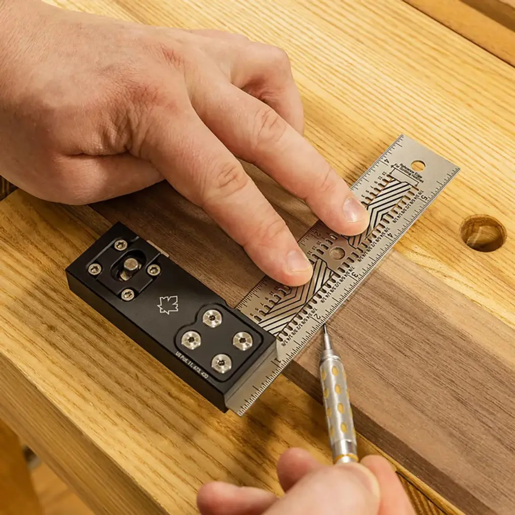 It's time to add Grip to your Measuring Tools with our brand new Precision Squares with our Patented Flex Grip. These Precision Squares are made with 301 Full Hard Stainless Steel for overall durability. We etch, then engrave each marking on our laser system to ensure each mark stands the wear and tear of everyday use. Patented Flex Tabs are used to grip to virtually any surface softer than the steel itself. That means no more slipping when marking or scribing your workpiece, metal, paper, and more. Scribing notches are a must and are spaced out every 1/16th for perfect, accurate lines across your entire project. Last but not least, each square has a balancing tab which is easy to engage, locks into place and allows you to balance and scribe right across your work piece with ease. Unlock it when not needed for your application. Tolerance Request: The engraving is within 0.004" and we set every square to within 0.002" over the length of the blade