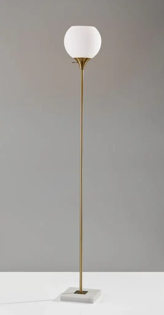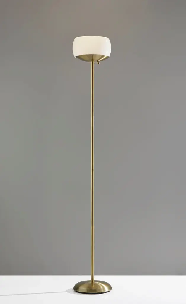 An elegant, yet modern look that is perfect for the office or living room, the Jessica 300W Torchiere takes your space to the next level. A milky white glass houses two bulbs for maximum light output. A simple rotary switch is located on a dome shaped base turning the lamp on and off. Made up of antique brass finished metal, this lamp exudes mid-century modern style. This lamp provides bright ambient lighting for large living spaces. An Adesso patented 300 Watt Double Socket construction allows for two crisscrossed sockets, each holding on/off 150 Watt incandescent or LED bulbs which provides approximately 3 times more light than a typical torchiere. A High/Low rotary socket switch is located on the socket. NOTE: Adesso bulb recommendations: use incandescent bulbs up to 150W or dimmable led bulbs (DO NOT USE: 3-way bulbs or CFL"™s). - Requires (2)150W Bulb(Not Included)- This Product is UL/ETL Listed