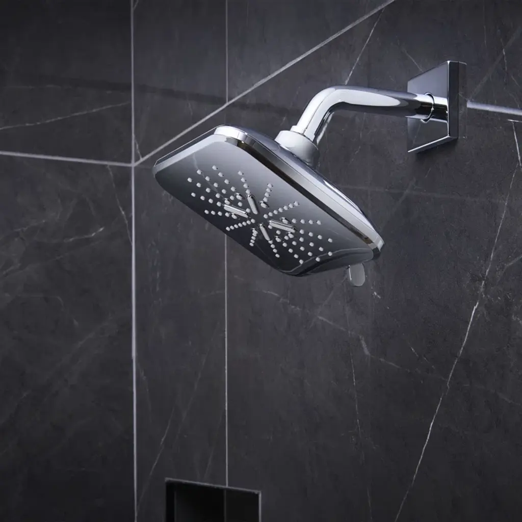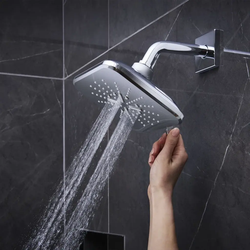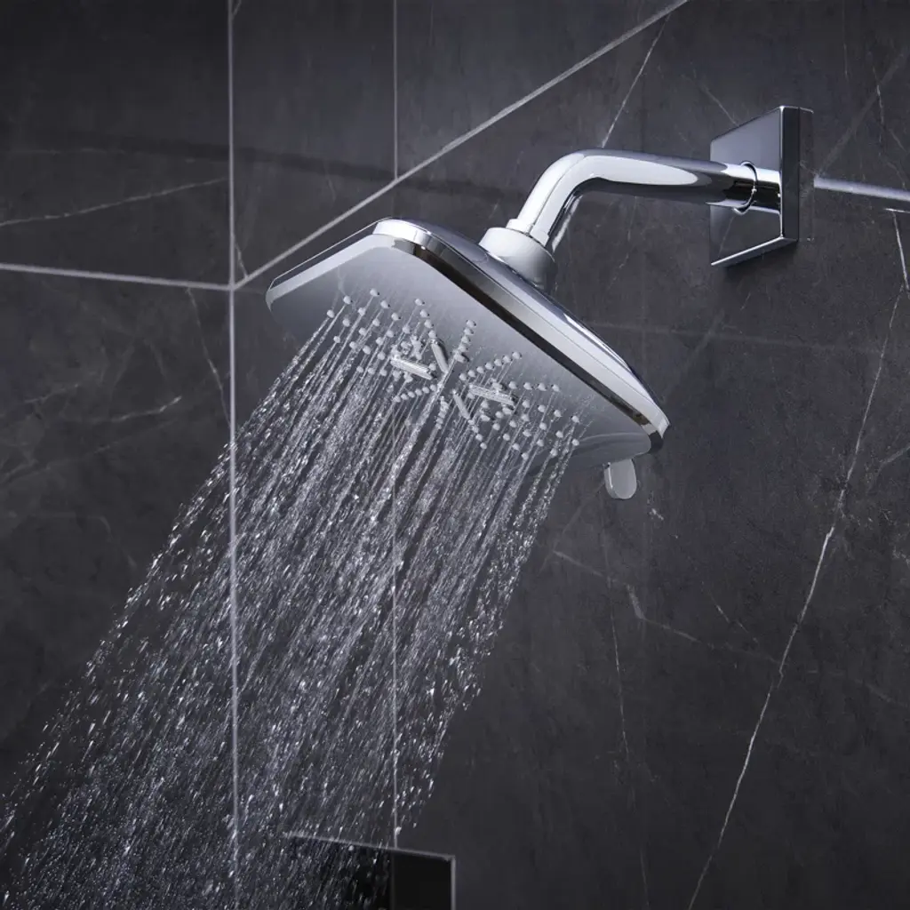 The Grohe rainshower smart active shower head is a sleek, water-saving design engineered in Germany that promises an unparalleled shower experience. This slim shower head features the innovative Grohe smart toggle lever, conveniently located at the bottom of the shower head, to easily alternate between three spray functions: gentle rain, refreshing active massage, and invigorating jet. With Grohe enjoy technology, each spray delivers exceptional enjoyment while using 30% less water than a standard shower head. For added water savings, Grohe drip stop minimizes dripping once the water is turned off.