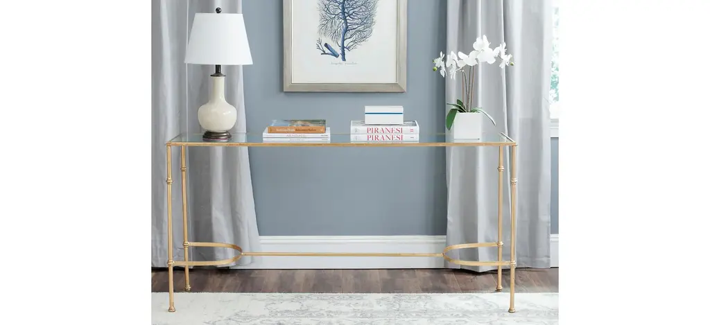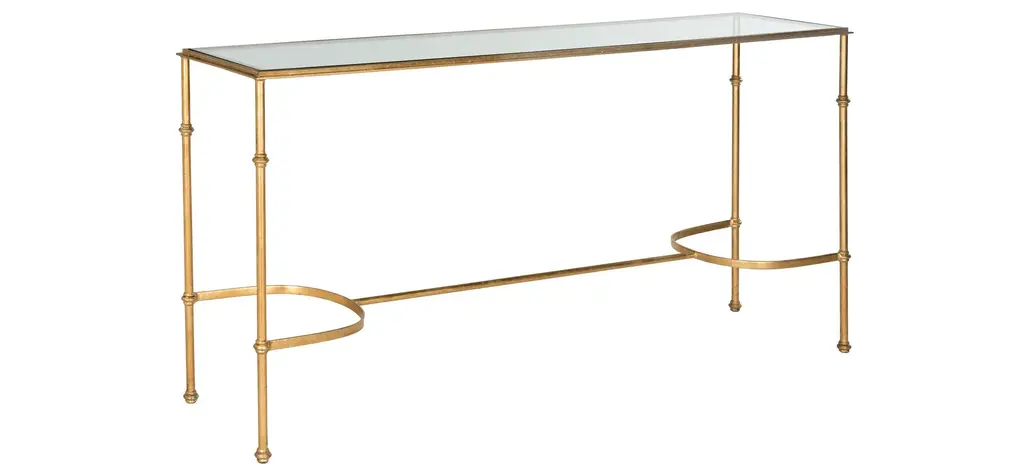 Inspired by couture jewelry, the Jett console table exudes understated elegance. Its tempered glass top adds an open airy look to any room, and its beautifully detailed iron base is timeless with its artful finish.