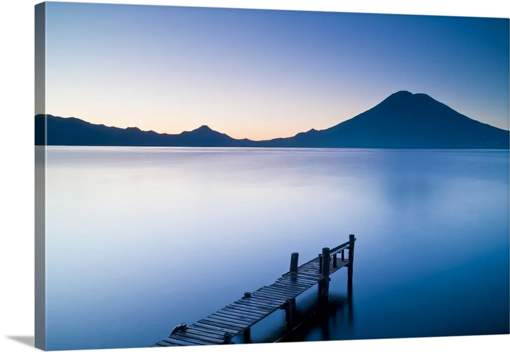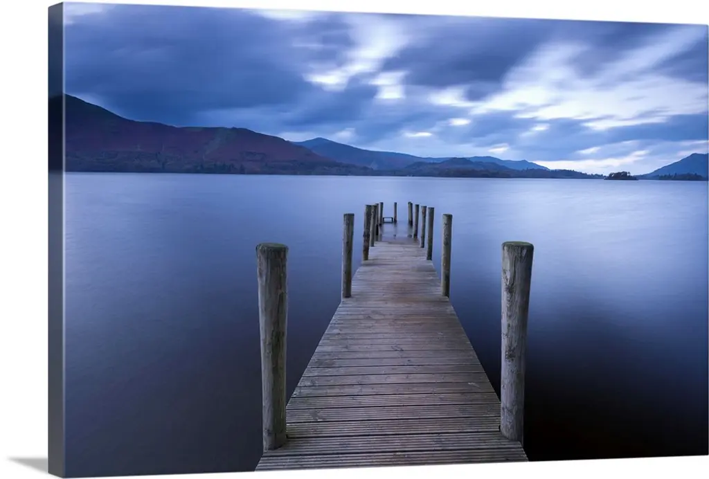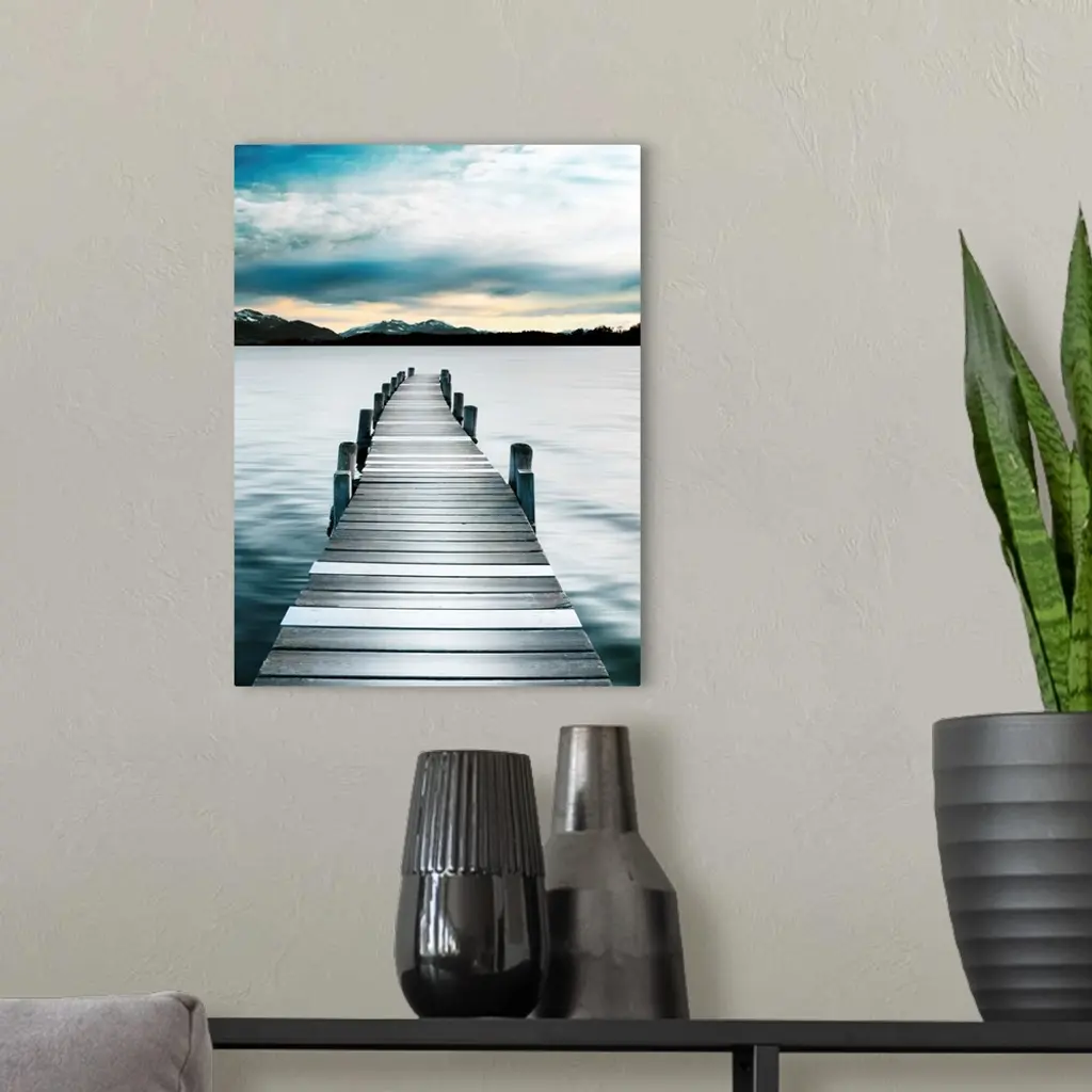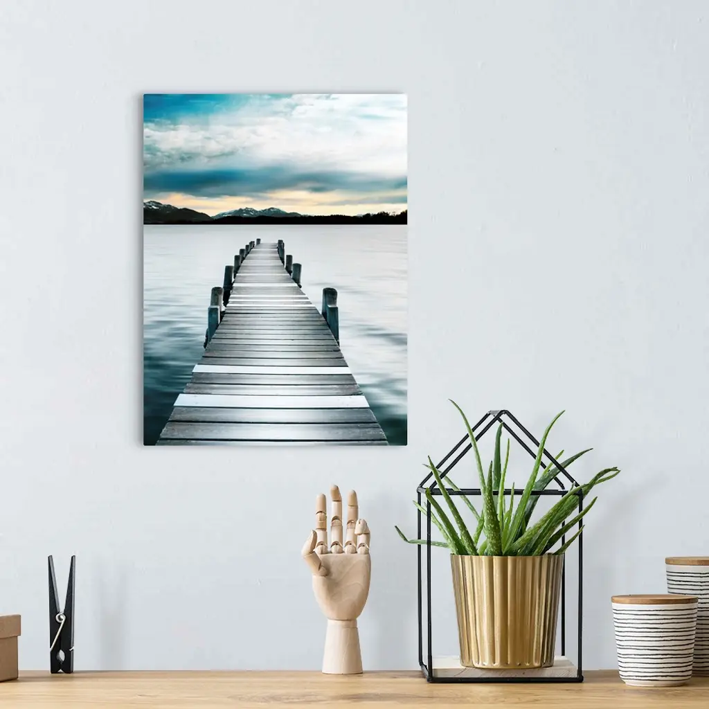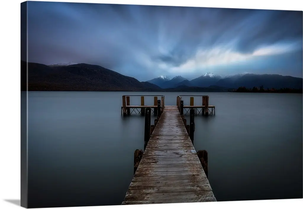 Photograph of a wooden boardwalk on a jetty with snow capped mountains in the distance.