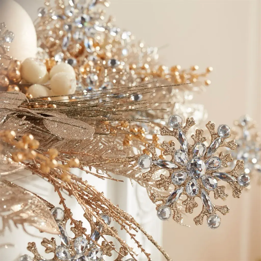 Add a touch of winter elegance to your holiday decor with this set of Jeweled Snowflake Sprays. Featuring delicate snowflake designs in shimmering gold and champagne tones with chic glittered accents, these sprays bring a festive sparkle to any setting. The sturdy wired stems offer endless versatility—display them in a vase, incorporate them into seasonal floral arrangements, or weave them into a holiday wreath for a dazzling winter touch. With a set of 2, you have plenty of options to create stunning festive floral displays throughout your home.