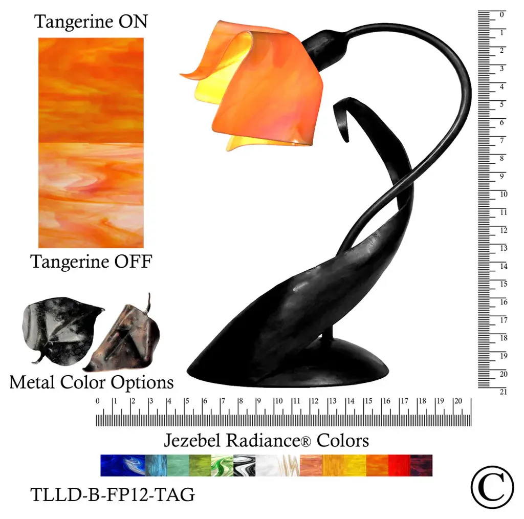 The Jezebel Radiance line of glass is premium, heirloom quality glass. Jezebel Radiance glass has streaks of bold, brilliantly intense color with a shiny surface. Glass shades are shaped using a process patented to Jezebel. This is a stunningly beautiful hand rolled sheet glass. There is no unsightly hot spot from a light bulb. Meanwhile, pure color and light will flood your space with ambiance. Jezebel Radiance Lazy Daisy Lamps are made in the USA of handcrafted glass using a process patented to Jezebel. The remarkably saturated hues can be ordered in a variety of glass colors. All Jezebel Radiance products are UL certified and 120 Volts. This light can be used with a medium base bulb (not included): Incandescent, Fluorescent or LED. Naturally occurring air bubbles, inclusions, textures and slight color variations demonstrate that your Jezebel Radiance Lazy Daisy Lamp is an original work of art. Your Jezebel Radiance Lazy Daisy Lamp is made of hand-forged iron and comes with our 2-year limited warranty. If your hardware or glass shade arrives defective in any way, please contact your retailer for claim instructions. Naturally occurring air bubbles, inclusions, textures and slight color variations demonstrate that the glass on your Jezebel Radiance Lazy Daisy Lamp is an original work of art. Our glass is handmade in the USA using a process patented to Jezebel. This entirely handmade light measures 20"H x 8.5"W x 16"D. The hand-forged iron base is wired for 120 volts and comes with a full-range in-line dimmer. This light can be used with a medium base bulb (not included): Incandescent, Fluorescent or LED. UL approved, dry, wet or damp or similar testing lab: UL compliant, for dry or damp areasHardwire or plug: PlugType of bulbs needed: Medium BaseWattage: 60 watt Incandescent or equivalent LEDNumber of bulbs required? (Included? Y/N): 1 (N)