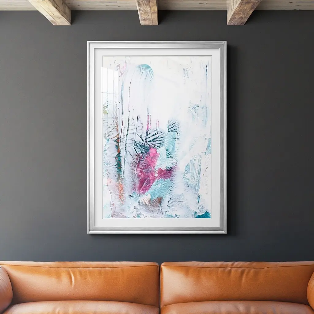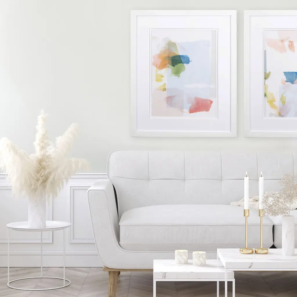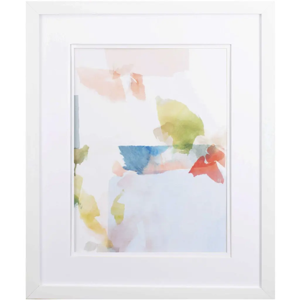 A pastel abstract that is double matted with crisp white mats and complimented with a sleek white frame.