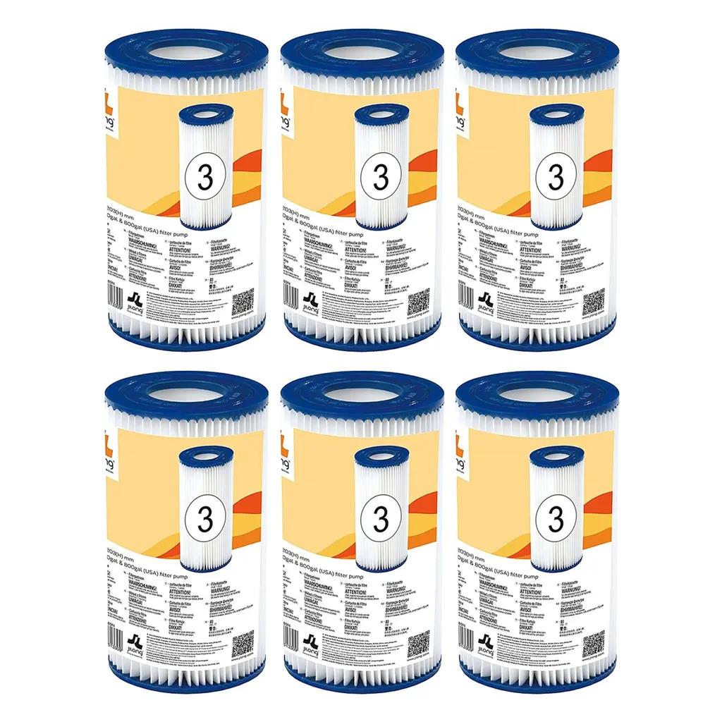 Enjoy crystal clear pool water this summer by keeping your pool pump operating at peak performance. Designed for the Avenli CleanPlus Filter Pump from JLeisure, the Jilong and Intex Filter Cartridge is easy to install, clean, reuse, and replace. Compatible with 530, 800, and 1,000-gallon pool pumps from other manufacturers, the Avenli CleanPlus cartridge is designed to effectively absorb dirt, leaving your backyard swimming pool clean and clear. The environmentally friendly pool filter can be reused several times. Simply rinse the filter out from time to time. To keep your pool pump in prime condition, replace the filter every 2 weeks for optimal performance. Measuring 4.17 x 4.17 x 8 inches, the small filter replacement cartridge is easy to install. Enjoy hours of summer fun in your sparkling clean above-ground pool thanks to the Avenli CleanPlus Filter Pump from JLeisure. Replacement filter cartridge designed for Jilong and Intex filter pumps Fits other filter pumps that take Type-A or C-sized filters Compatible with 530, 800, and 1,000 gallon per hour filter pumps Avenli pool filter cartridge effectively absorbs dirt for clean, sparkling water Replace every 2 weeks to keep your pool pump in prime condition Environmentally friendly pool filter cartridge is reusable; Clean by washing out Color: White/Blue Dimensions (L x W x H): 4.17 x 4.17 x 8 inches Weight: 4.17 pounds Quantity: 6