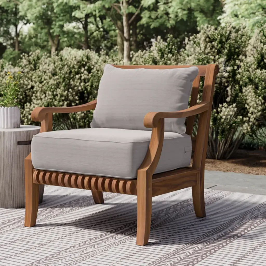 This solid teak wood patio chair is one sure way to bring extra seating and coastal style to your back porch. It's made in the USA from UV- and rust-resistant teak with a natural wood grain that's sure to complement any color palette or aesthetic. A classic armchair silhouette and airy, slatted wood frame let the rainwater trickle through, while included foam-filled back and seat cushions offer extra support. Best of all, each removable cushion is wrapped in beige polyester covers that can be easily removed and thrown right in the washer.