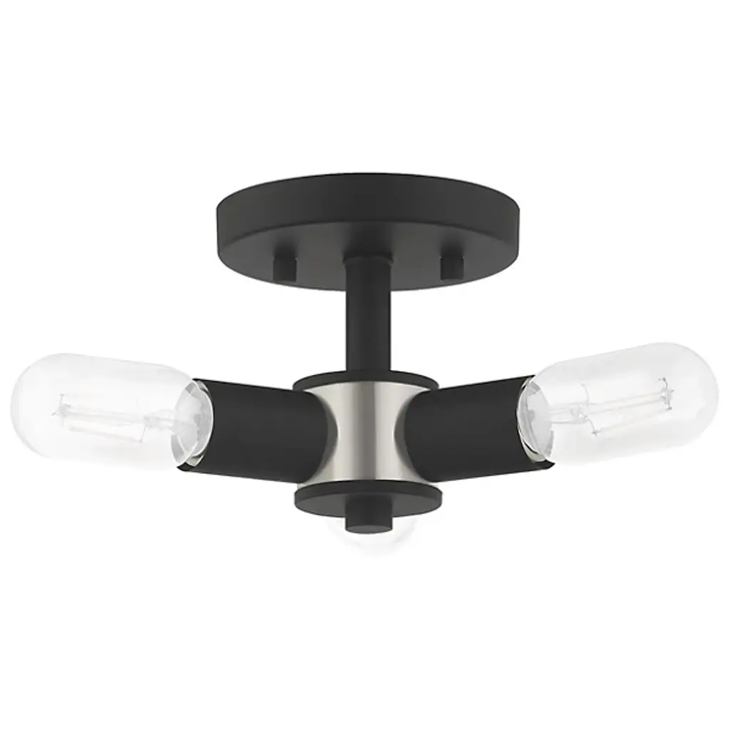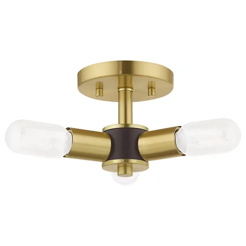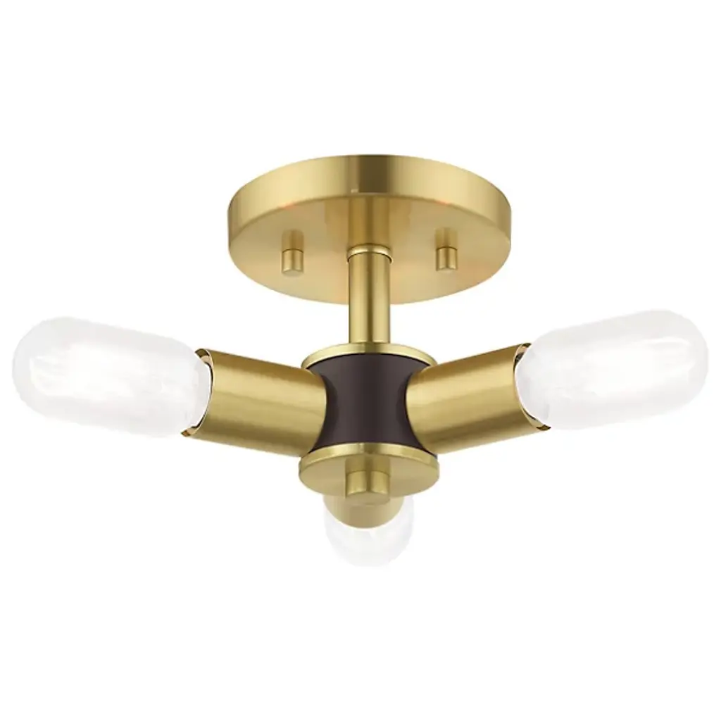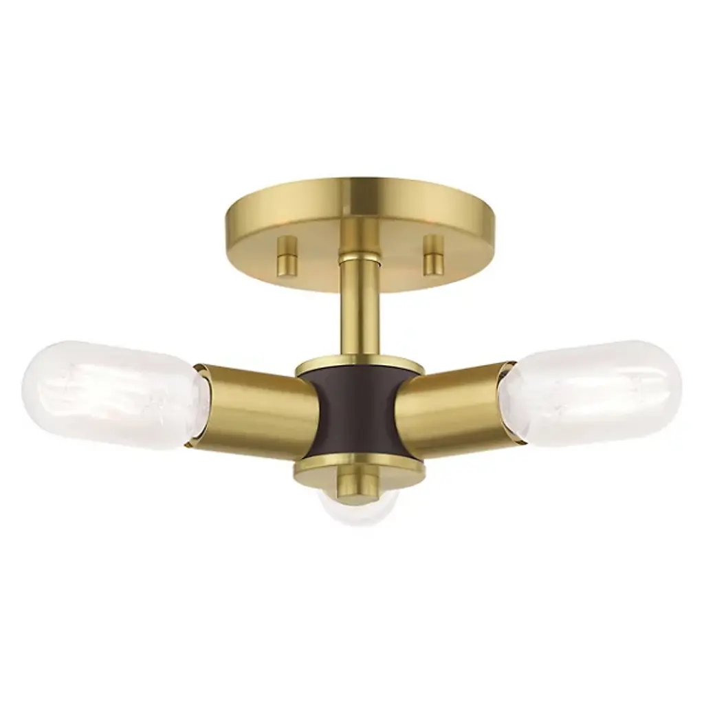 Deliver a surge of sophisticated charm to your rooms with the mid-century-inspired exposed bulb design of the Joanna Semi Flushmount from Alder & Ore. This piece is a natural fit with the understated or eclectic setting. It's a tidy look overhead as it mounts close to the wall with a short down rod and low-profile canopy. Bold cylindrical lamp holders shoot out from a central body in a triangular fashion with a dapper finish. The triangulating formation of the bulbs directs the light spread towards every wall in the room. The exposed bulbs charm with their brilliant filament as they produce a warm, generous light.