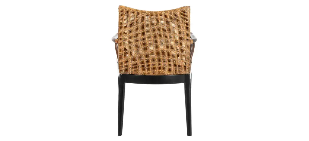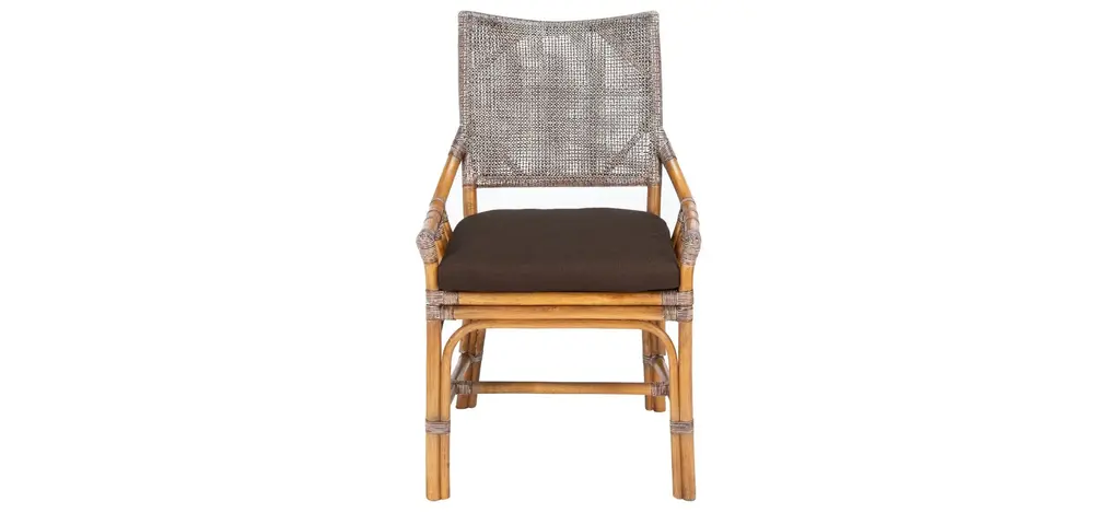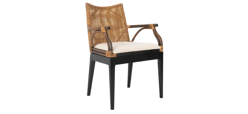 A contemporary take on British Colonial style, this Johan Armchair revitalizes classic forms for today's coastal chic interiors. Brown woven rattan and bamboo inspired open arms are fabulously offset by sleek black mahogany legs and smooth white cushion, giving Johan a breezy, tropical feel.