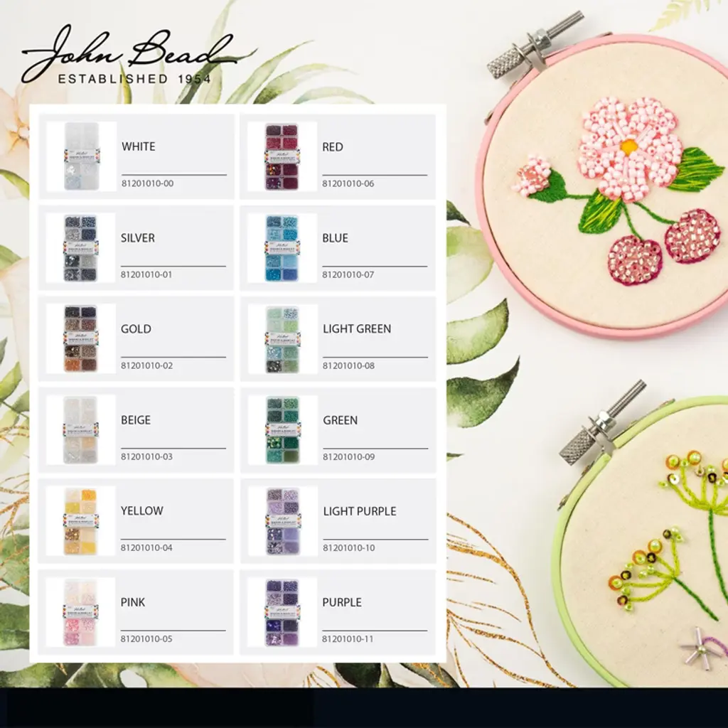 John Bead Sequins and Beads Kit includes a versatile assortment featuring 81 grams of mixed beads in 10 diverse types that differ in shapes and materials. This colorful palette beads box is a must-have beading kit and a treasure trove for all beginner and professional crafters who seek variety and inspiration for their projects. Dive into an array of bead types, including sequins, glass seed beads, and more! Providing endless possibilities to infuse texture, color, and dimension into your creations. This beads set also ensures you have ample supplies to experiment with, allowing your creativity to flow freely.Details✬ Available in multiple colors✬ 10 diverse types of beads✬ Store in a clear container with 10 divided compartments✬ Item Dimension: 5 x 2.5 x 1 inch ✬ Box Weight: 81 GramsApproximate Number of Beads✬ 4mm Pearls: 170 Pieces✬ 2.5mm Pearls: 500✬ Bugles: 930 Pieces✬ 2.5mm Sequins: 450 Pieces✬ 1.5mm Sequins: 1000 Pieces✬ 2mm Beads: 490 Pieces✬ 1.5mm Beads: 1000 PiecesPLEASE NOTE: As we do try our very best to showcase the products as closely as possible, there may be (at times), some slight variations between the manufacturer's colour batches and sizes as well as your computer screen.