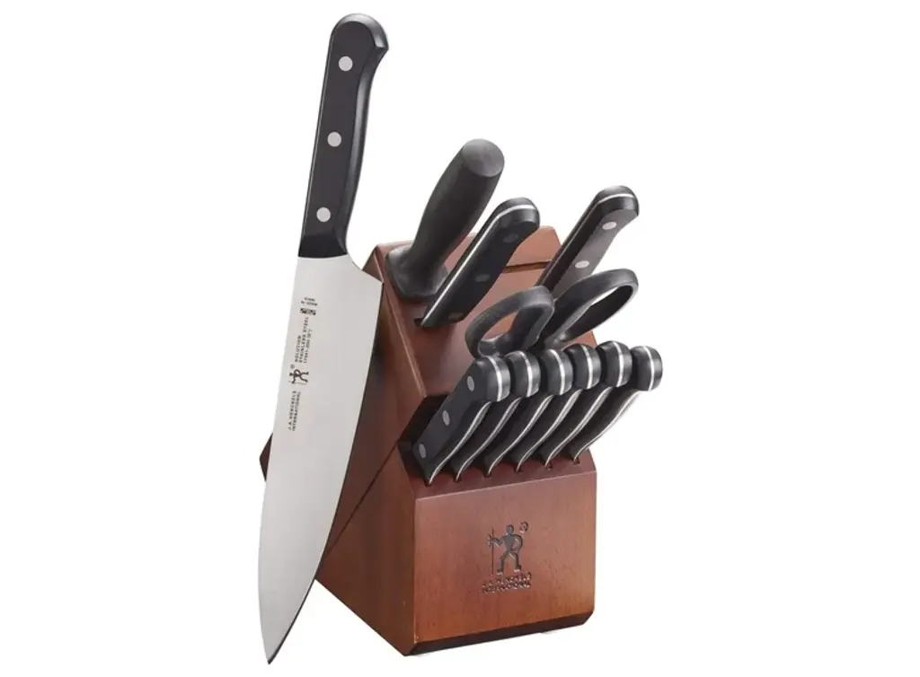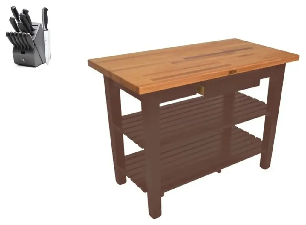 John Boos Oak Classic Country Table 48x30 And Henckels Knife Set, Walnut Stain, Two Shelves, No Drawer, Casters