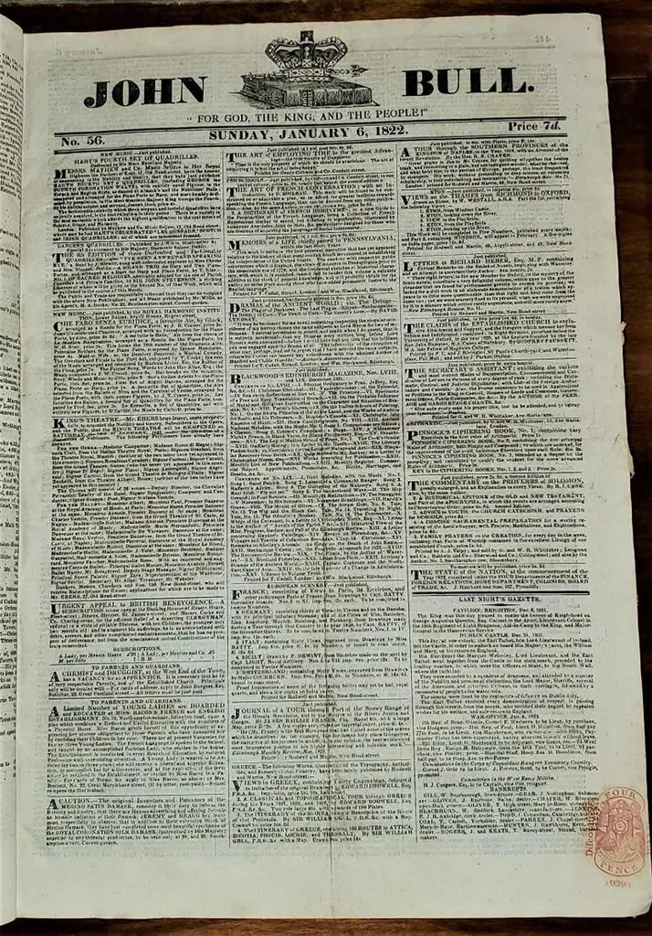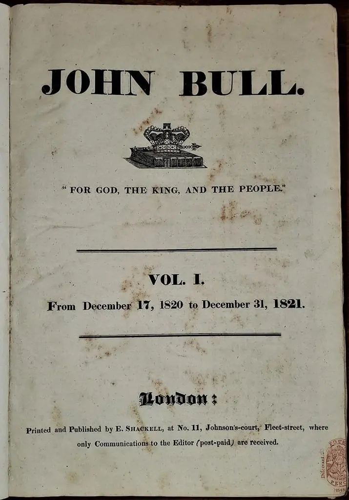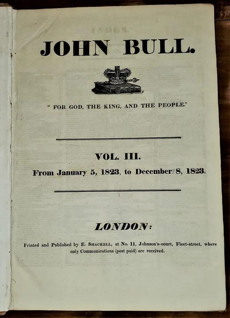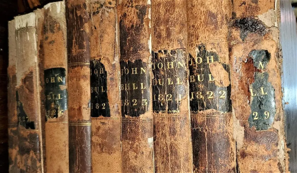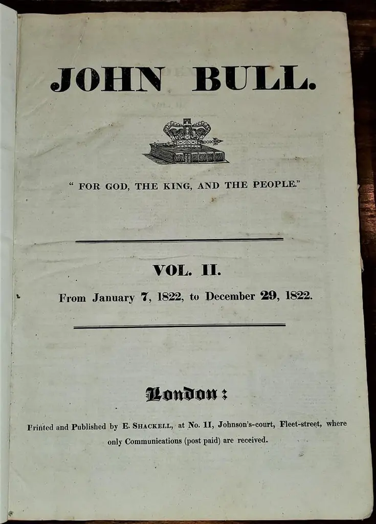 Presenting a set of 9 volumes, leather bound John Bull yearly annuals.All the weekly newspaper publications of John Bull for the years 1820-1829 (Inclusive), bound together and sold as ‘Annuals’.This is such a rare find ….. You will not find these anywhere else …. Truly historic!It contains the very first edition ever printed!John Bull is a national personification of the United Kingdom in general and England in particular, especially in political cartoons and similar graphic works. He is usually depicted as a stout, middle-aged, country dwelling, jolly, matter-of-fact man.John Bull originated in the creation of Dr. John Arbuthnot, a friend of Jonathan Swift (author of Gulliver’s Travels) and satirist Alexander Pope in 1712, and was popularized first by British print makers. Arbuthnot created Bull in his pamphlet Law is a Bottomless Pit (1712). The same year Arbuthnot published a four-part political narrative The History of John Bull. In this satirical treatment of the War of the Spanish Succession a bold, honest and forthright clothier John Bull brings a lawsuit against various figures intended to represent the kings of France and Spain as well as institutions both foreign and domestic.Originally derided, William Hogarth and other British writers made Bull “a heroic archetype of the freeborn Englishman.” Later, the figure of Bull was disseminated overseas by illustrators and writers such as American cartoonist Thomas Nast and Irish writer George Bernard Shaw, author of John Bull’s Other Island.Starting in the 1760s, Bull was portrayed as an Anglo-Saxon country dweller. He was almost always depicted in a buff-colored waistcoat and a simple frock coat (in the past Navy blue, but more recently with the Union Jack colors). Britannia, or a lion, is sometimes used as an alternative in some editorial cartoons.As a literary figure, John Bull is well-intentioned, frustrated, full of common sense, and entirely of native country stock. Unlike Uncle Sam later, he is not a figure of authority but rather a yeoman who prefers his small beer and domestic peace, possessed of neither patriarchal power nor heroic defiance. Arbuthnot provided him with a sister named Peg (Scotland), and a traditional adversary in Louis Baboon (the House of Bourbon in France). Peg continued in pictorial art beyond the 18th century, but the other figures associated with the original tableau dropped away. John Bull himself continued to frequently appear as a national symbol in posters and cartoons as late as World War I.The original John Bull was a Sunday newspaper established in the City, London EC4, by Theodore Hook in 1820 ……… This collection contains the original of the very first edition!!!!!It was a popular periodical that continued in production through July 1892.Provenance: Purchased from a Private English Collector 23 years ago, in Ireland.Condition: Some loose covers, losses to the bindings, some foxing and some creasing, but overall in relatively good condition …. what do you expect ?? They are 200 years old!!Dimensions: Each volume is 16? tall, 11.15? wide and 1.2? deep.