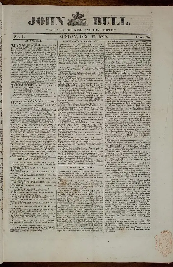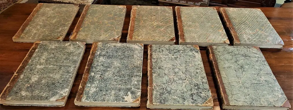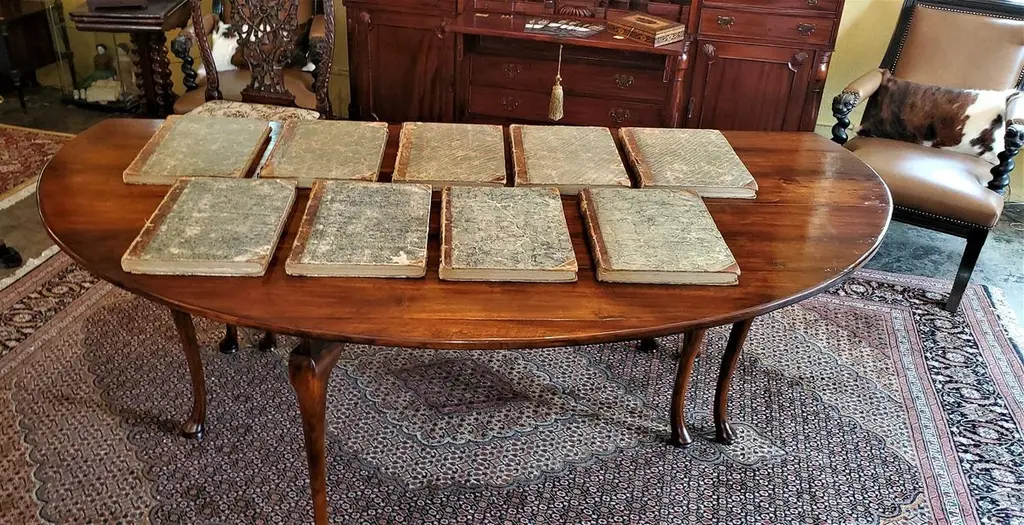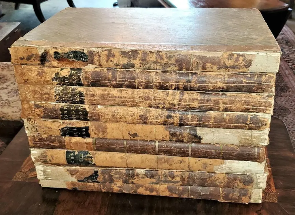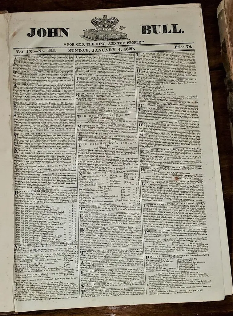 Presenting a set of 9 volumes, leather bound John Bull yearly annuals.All the weekly newspaper publications of John Bull for the years 1820-1829 (Inclusive), bound together and sold as ‘Annuals’.This is such a rare find ….. You will not find these anywhere else …. Truly historic!It contains the very first edition ever printed!John Bull is a national personification of the United Kingdom in general and England in particular, especially in political cartoons and similar graphic works. He is usually depicted as a stout, middle-aged, country dwelling, jolly, matter-of-fact man.John Bull originated in the creation of Dr. John Arbuthnot, a friend of Jonathan Swift (author of Gulliver’s Travels) and satirist Alexander Pope in 1712, and was popularized first by British print makers. Arbuthnot created Bull in his pamphlet Law is a Bottomless Pit (1712). The same year Arbuthnot published a four-part political narrative The History of John Bull. In this satirical treatment of the War of the Spanish Succession a bold, honest and forthright clothier John Bull brings a lawsuit against various figures intended to represent the kings of France and Spain as well as institutions both foreign and domestic.Originally derided, William Hogarth and other British writers made Bull “a heroic archetype of the freeborn Englishman.” Later, the figure of Bull was disseminated overseas by illustrators and writers such as American cartoonist Thomas Nast and Irish writer George Bernard Shaw, author of John Bull’s Other Island.Starting in the 1760s, Bull was portrayed as an Anglo-Saxon country dweller. He was almost always depicted in a buff-colored waistcoat and a simple frock coat (in the past Navy blue, but more recently with the Union Jack colors). Britannia, or a lion, is sometimes used as an alternative in some editorial cartoons.As a literary figure, John Bull is well-intentioned, frustrated, full of common sense, and entirely of native country stock. Unlike Uncle Sam later, he is not a figure of authority but rather a yeoman who prefers his small beer and domestic peace, possessed of neither patriarchal power nor heroic defiance. Arbuthnot provided him with a sister named Peg (Scotland), and a traditional adversary in Louis Baboon (the House of Bourbon in France). Peg continued in pictorial art beyond the 18th century, but the other figures associated with the original tableau dropped away. John Bull himself continued to frequently appear as a national symbol in posters and cartoons as late as World War I.The original John Bull was a Sunday newspaper established in the City, London EC4, by Theodore Hook in 1820 ……… This collection contains the original of the very first edition!!!!!It was a popular periodical that continued in production through July 1892.Provenance: Purchased from a Private English Collector 23 years ago, in Ireland.Condition: Some loose covers, losses to the bindings, some foxing and some creasing, but overall in relatively good condition …. what do you expect ?? They are 200 years old!!Dimensions: Each volume is 16? tall, 11.15? wide and 1.2? deep.
