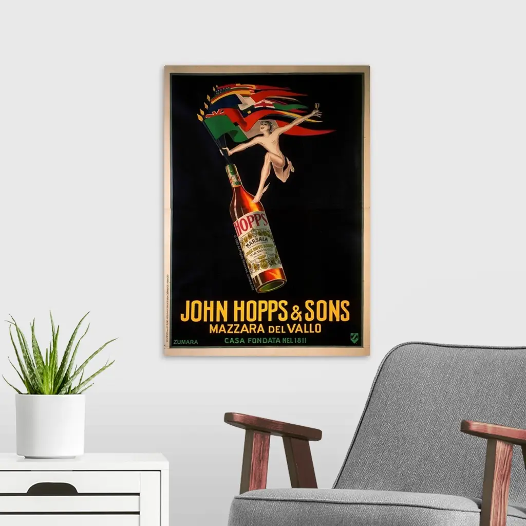 Vintage poster of a bottle filled with liquid and country flags sticking out from the top. A person is painted grabbing onto the flags and flying atop the bottle.