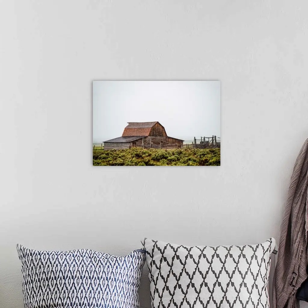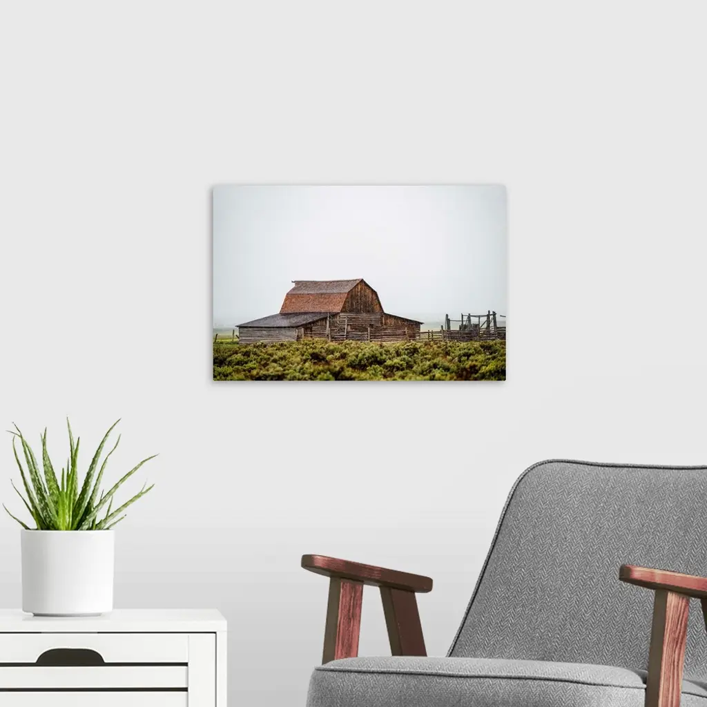 View of the John Moulton Barn with fog rolling in, Grand Teton National Park, Wyoming.