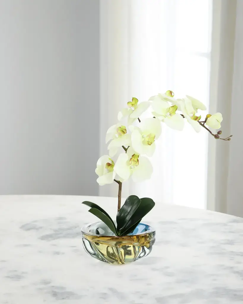 A single stem of soft yellow orchid is simply set in an amber and blue glass container Handcrafted of polypropylene, rayon/cellulose acetate, and glass Approx. 8"L x 8.0"W x 24"T Item weight, 6.0 lbs. For indoor use Wipe clean Made in USA from imported materials Proposition 65 warning for California residents Backed by a limited manufacturer’s warranty. ( Click here for warranty information ) About the John-Richard Collection Founded in 1980 in Greenwood, Mississippi, the John-Richard Collection is known for a strong design staff that travels the world for inspiration. Channeling cultural and historical influences, the company creates distinctive artisan-crafted furniture, lighting, wall art, mirrors, and decorative accessories that make a lasting impression. What's more, an eye for future trends in luxury home furnishing sets the John-Richard Collection apart. They skillfully blend the best of what is new in home fashion with the great designs of the past, resulting in updated designs that fit perfectly with an array of styles.