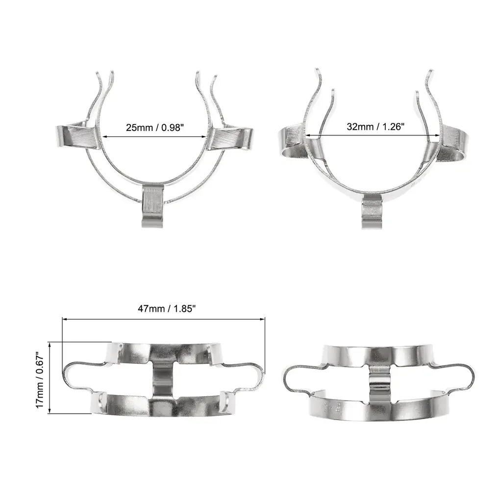 Description: 1.Made from Steel, which makes it have a higher hardness than plastic ones.2.To prevent a joint from separating during a reaction process, the clips can be used to secure the two sides together.3.Widely used on expert or beginner scientific labs.Specifications:Top Opening Width: 19mm / 0.75 InchTop Inner Diameter: 25mm / 0.98 InchBottom Opening Width: 25mm / 0.98 InchBottom Inner Diameter: 32mm / 1.26 InchOverall Size: 47x17mm / 1.85*0.67 Inch (D*H)Weight: 7gPackage Content:1 x Joint Clip