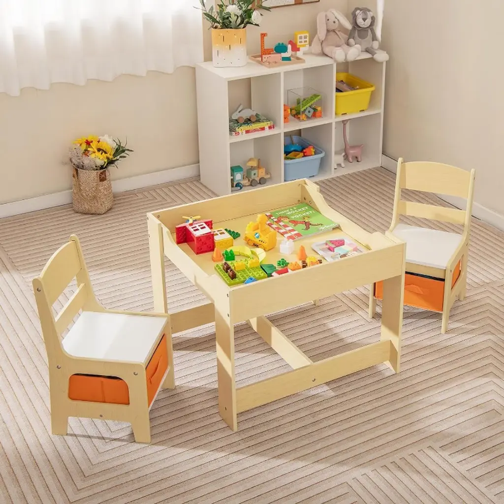 Description Encourage creativity and learning with this versatile 3-in-1 kids table and chair set featuring a double-sided tabletop for drawing, writing, or studying. The white side offers a smooth writing surface, while the detachable blackboard side inspires artistic play. Designed with ergonomic backrests and footrests, it promotes proper posture and comfort for toddlers. Crafted from child-safe wood with ASTM certification, this sturdy set boasts rounded corners to protect little hands. Hidden storage beneath the tabletop and storage boxes within each chair help keep toys, books, and snacks organized, fostering good habits. Lightweight and portable, this set fits perfectly in nurseries, bedrooms, or playrooms, making it an ideal gift for boys and girls. Product Details Dimensions: 29 L x 27.5 W x 24H (Tabletop 4thickness) Material: Child-friendly wood with natural finish Shape: Square Style: Modern Item Weight: 17.5 Pounds Assembly Required: Yes What You Get When You Buy 1 x Kids Activity Table with Double-Sided Top 2 x Chairs with Storage Boxes Assembly Instructions Customer Support Contact Ideal For Promoting creativity and learning through drawing, writing, and reading activities for toddlers. Parents seeking ergonomic furniture that supports proper posture and comfort for young children. Organizing children’s toys, books, and art supplies with built-in storage solutions. Gift buyers looking for a safe, lightweight, and versatile kids’ table and chair set. After-Sales Service 【Dedicated Support】: Responsive customer service assists with assembly and product inquiries to ensure smooth setup and satisfaction. 【Warranty & Repairs】: Reliable product support with warranty coverage that guarantees durability and long-term use. 【Easy Assembly】: Includes clear, numbered parts and illustrated instructions for quick, hassle-free assembly at home.