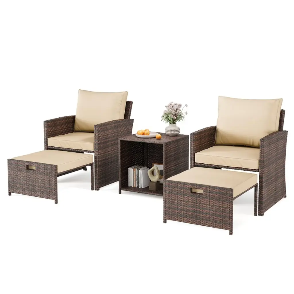 Experience exceptional comfort and style with this 5-piece outdoor patio sofa set from Jojoka. Featuring two high back lounge chairs, two versatile ottomans, and a matching table, this set brings a refined and cohesive look to your outdoor space. The chairs and ottomans are wrapped in all-weather PE rattan, built over sturdy frames to ensure durability and longevity. Soft, supportive cushions enhance your comfort while the removable covers make upkeep easy. Whether on the balcony, porch, or poolside, this set is ideal for relaxing, entertaining, or simply enjoying the outdoors.