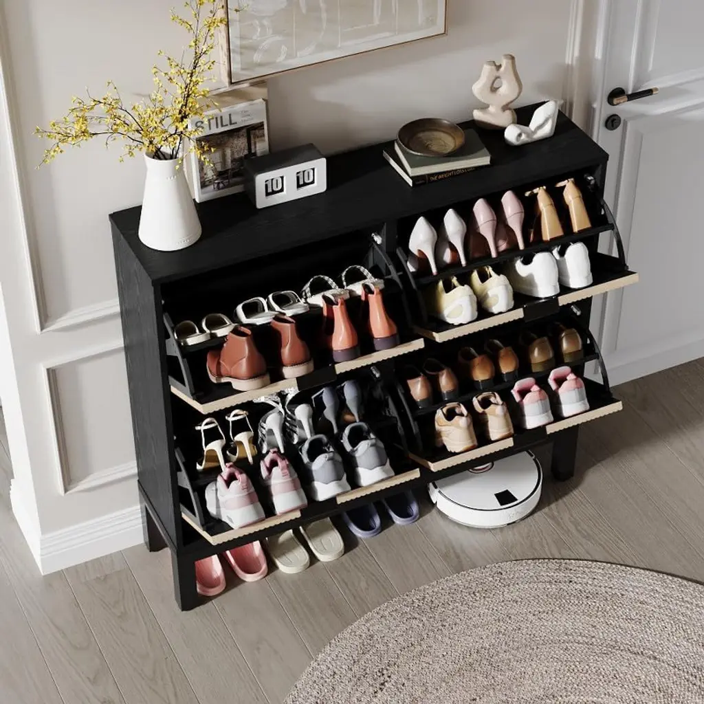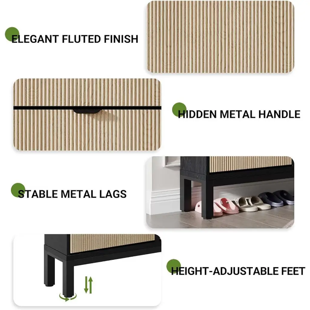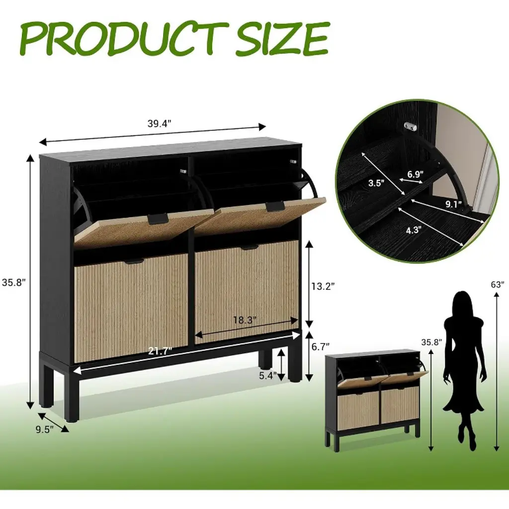 Description: Keep your entryway tidy and stylish with this farmhouse-inspired shoe storage cabinet featuring 4 flip drawers with two-tier storage each, accommodating 16-20 pairs of shoes. Its polished fluted panel detailing and contrasting color design add rustic charm to any foyer, hallway, or small space. Designed to maximize storage without occupying much floor area, the slim cabinet includes adjustable feet for stability on uneven surfaces and removable dividers to customize space for boots, sneakers, heels, and more. Supported by durable metal legs and equipped with a tip-over restraint kit, it ensures long-lasting stability and safety. Easy to assemble with labeled parts and clear instructions, this freestanding organizer combines practicality with farmhouse elegance. Dimensions: 39.4 inches W x 9.5 inches D x 35.8 inches H Material: Engineered wood, metal legs Shape: Rectangular Number of Shelves: 4 Mounting Type: Floor mount Special Features: Adjustable shelves, space-saving, durable, tip-over restraint kit What You Get: 1 Farmhouse fluted shoe cabinet with 4 flip drawers and adjustable shelving Tip-over restraint kit for safety Assembly hardware and detailed instruction manual After-Sales Service: Our customer support team offers prompt assistance within 24 hours to help with assembly or any concerns. We ensure hassle-free setup and satisfaction with your purchase.