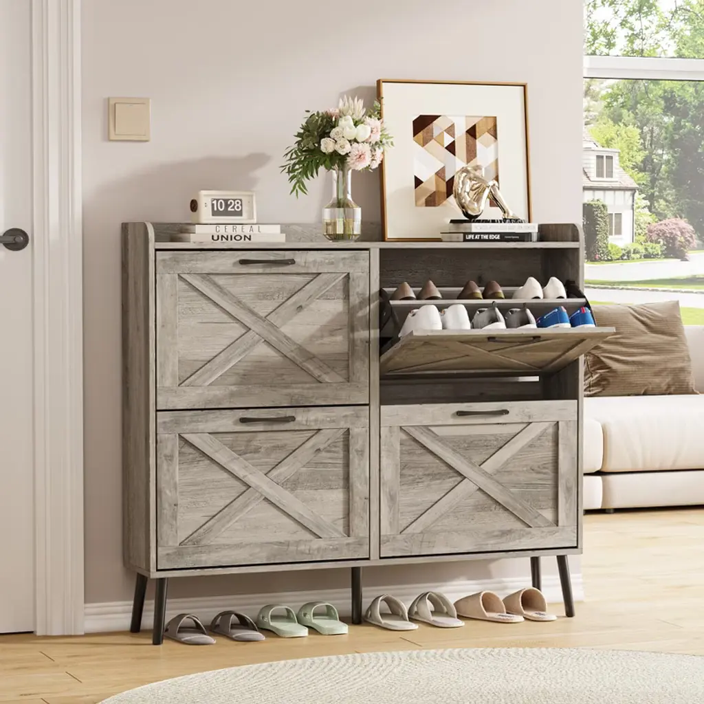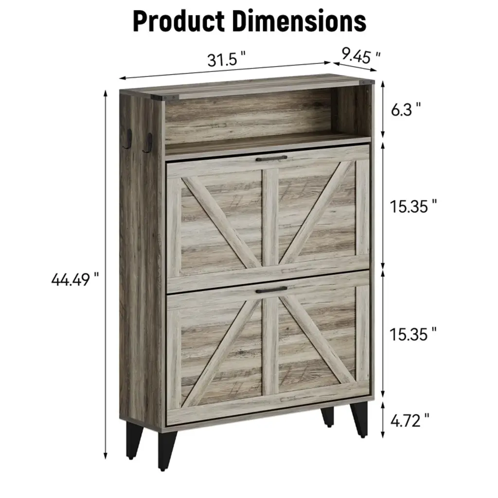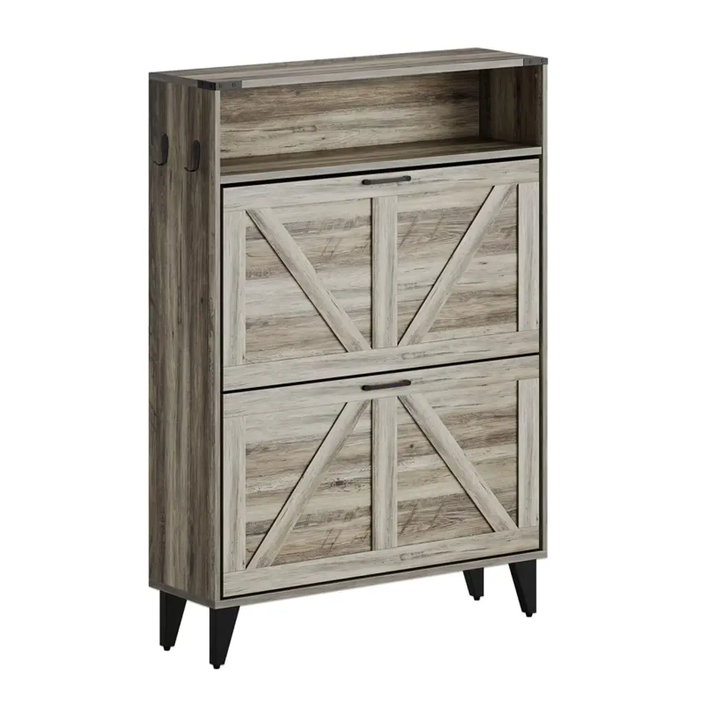 Bring organization and style to your entryway with this slim shoe storage cabinet. Perfectly sized for narrow spaces, it features two flip drawers with removable dividers that let you customize storage for sneakers, flats, or boots. The space-saving design helps reduce clutter while keeping your shoes neatly tucked away and dust-free.The farmhouse-inspired look combines durable particle board with sleek black handles and sturdy metal legs, making it a versatile piece that blends with modern and traditional d¨¦cor. A roomy top surface and open cubby add extra functionality, providing space for everyday essentials like wallets, keys, or decorative accents.With built-in safety features like an anti-toppling device, this shoe cabinet is a secure choice for family homes. Easy to assemble and maintain, it¡¯s the perfect storage solution for entryways, hallways, living rooms, or porches.