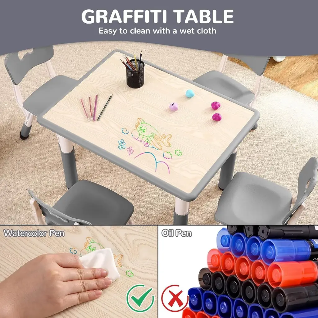 Jojoka Kids Table and 4 Chair Set,Height Adjustable Toddler Table and Chairs Set with Non-Slip Table Legs&Organizer Graffiti Desktop,Preschool Activity Art Craft Table for 4