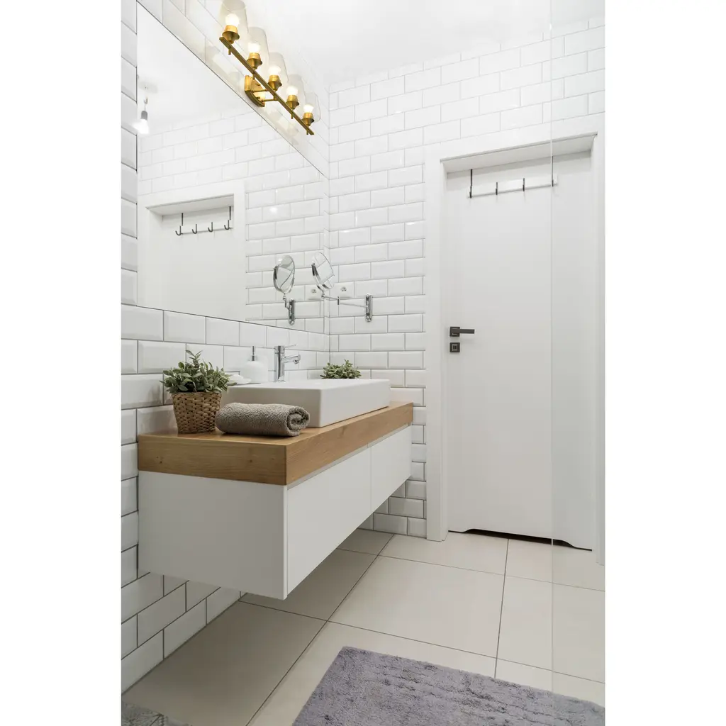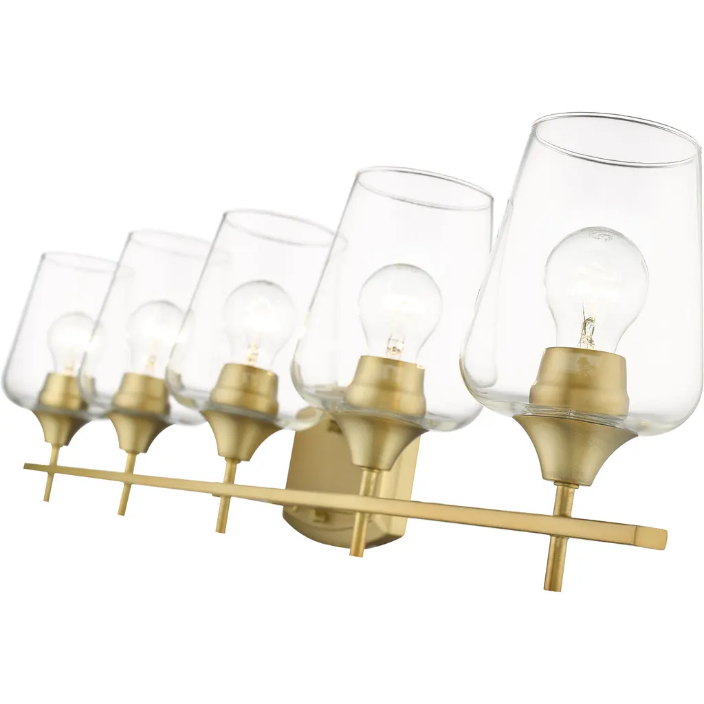 Upscale sophistication with a Mid Century Modern vibe tells the story of this elegant five-light vanity light. A blend of delightful materials offers stunning large glass shades with rich Olde Brass finish metal, delivering a gorgeous effect in a custom master or guest bath suite.