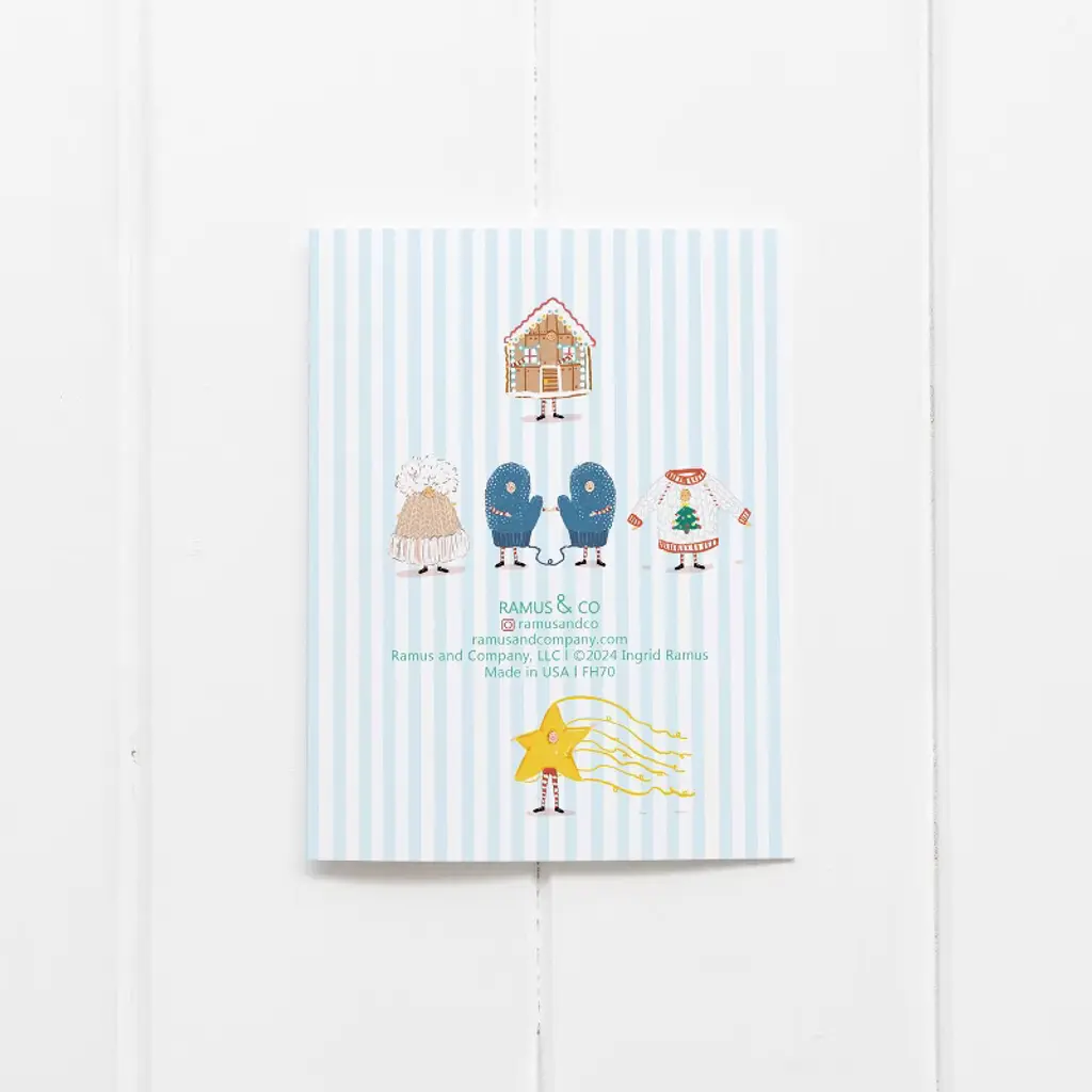 This 3-pack of Winter/Holiday/Christmas greeting cards is elegantly illustrated by artist Ingrid Ramus, founder and owner of the Ramus & Co brand. The cards are blank inside. All greeting cards are made in the USA on heavyweight uncoated and locally-manufactured card stock. Each card is individually wrapped in TUV Austria certified-compostable PLA sleeves that meet both ASTM D6400 & EN 13432 standards. Each card is accompanied by a hand-embossed envelope made with heavyweight 95lb paper and a peel-and-stick flap - no licking envelopes here! All Ramus & Co. greeting cards are printed on FSC¬¨¬ and SFI¬¨¬ certified paper sourced from a regional mill that harnesses 66% of its energy from on-site sustainable sources, such as emission-free hydroelectricity and biomass co-generation from wood waste. Additionally, our greeting cards are thoughtfully packaged in bags made from certified compostable PLA material. Husband-and-wife team Calvin and Ingrid Ramus founded Ramus & Company in 2019, in New England, USA. Ingrid, the creative designer behind the brand, originates from Mexico, where she cultivated her skills in fashion and textile design. Drawing from her unique and inquisitive perspective on preppy style, Ingrid prolifically designs whimsical yet classic stationery and lifestyle items..