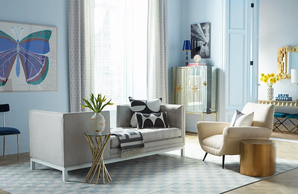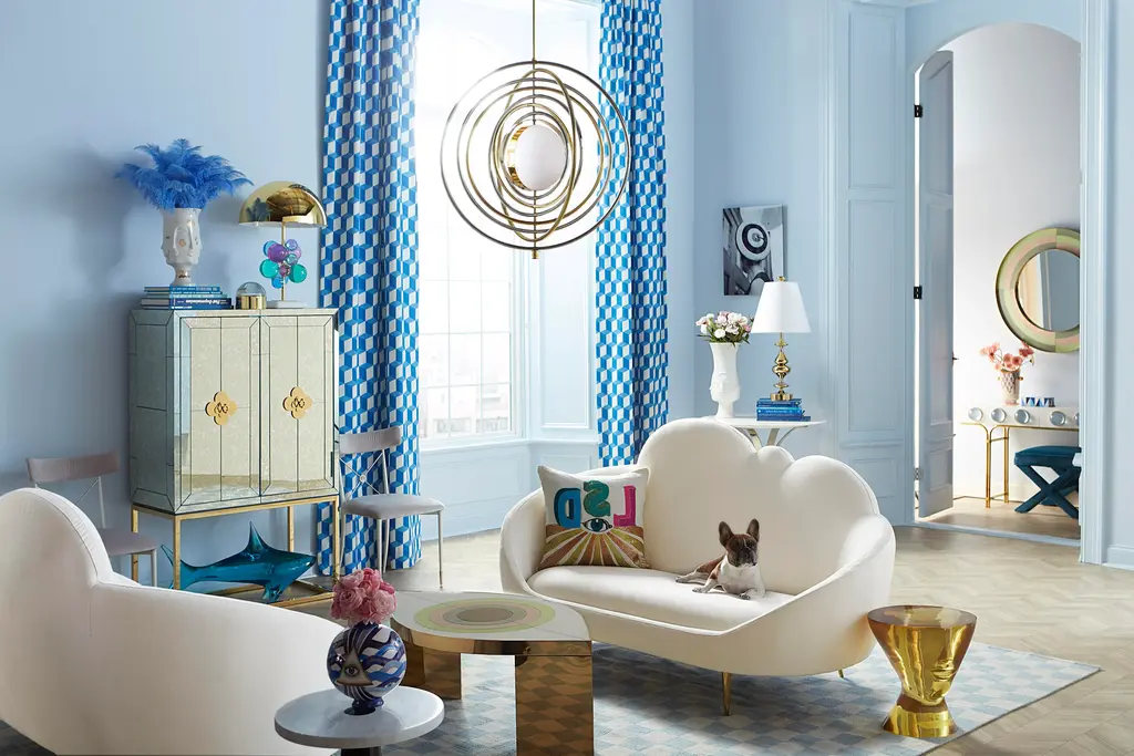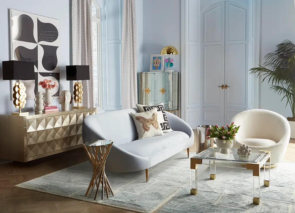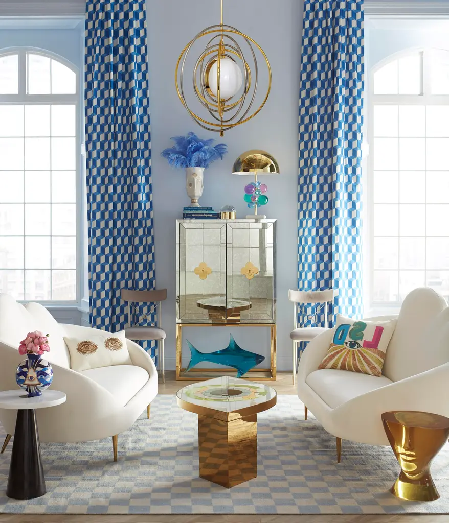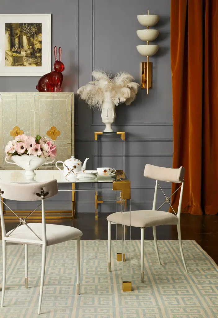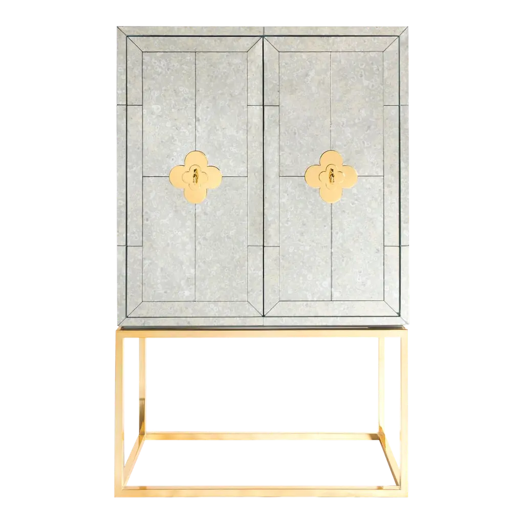 Minimalist forms meet Maximalist glamour. Antiqued mirror with a polished brass base. The robin's egg blue interior is fitted with four adjustable tempered glass shelves, plus six wire-bound drinking glass shelves inside the doors. Two drawers at the base will keep all your mixing accoutrements at hand. The finishing touches—quatrefoil handles and escutcheons—give our Delphine Bar over-the-top allure. Care Instructions: Dust with a soft, dry cloth Spot clean with a damp cloth Never use harsh chemical or abrasive cleaners that could erode protective topcoats Avoid contact with hot items Wipe spills immediately, do not allow water to collect on the surface Use a brass polish on brass detailing, but take care to avoid cleaning solution lingering on crevices or coming in contact with adjacent materials