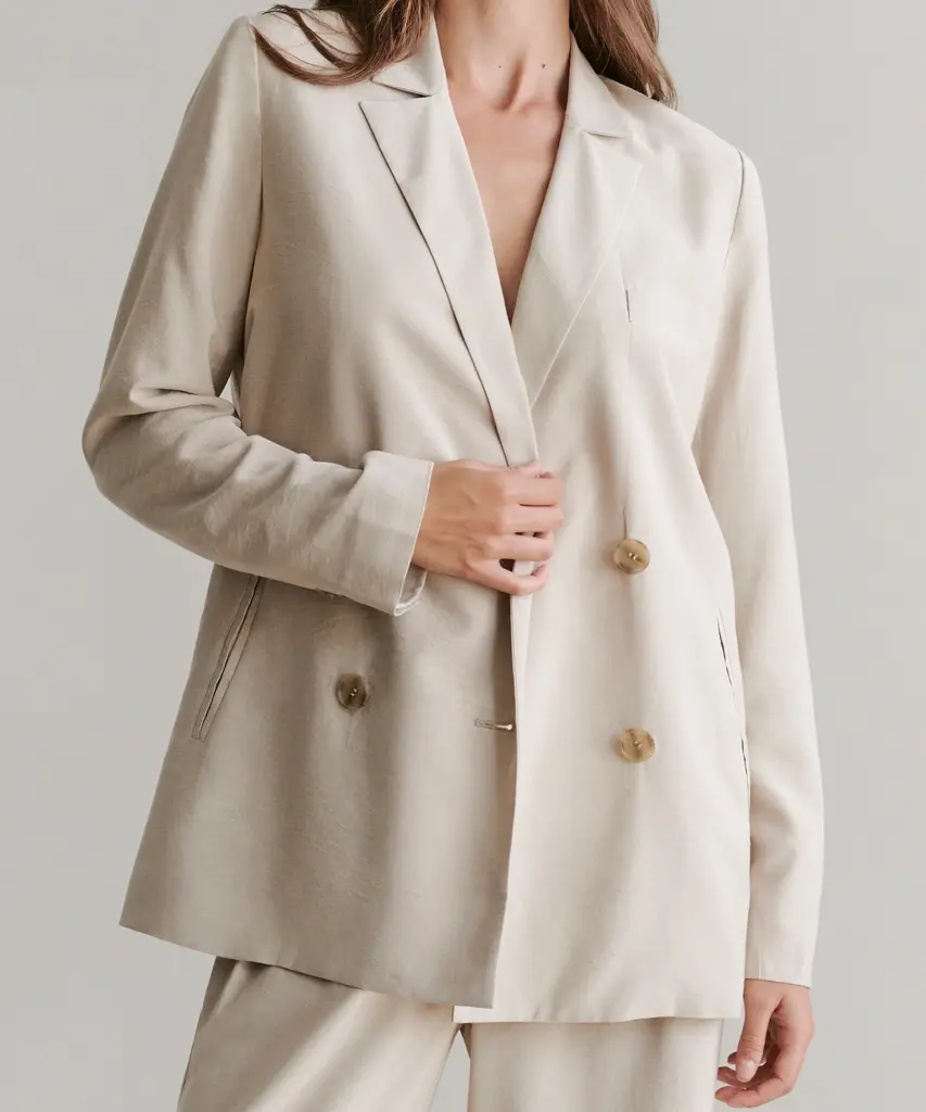 Jones Blazer TanClassic tailoring meets an ultra-lightweight feel for a classic blazer you can style all year long.Pair with the Jones Trouser for a subtle and elevated take on the modern power suit. 89% viscose, 11% polyamide. Made in China of Italian fibers.Double-breasted blazer.