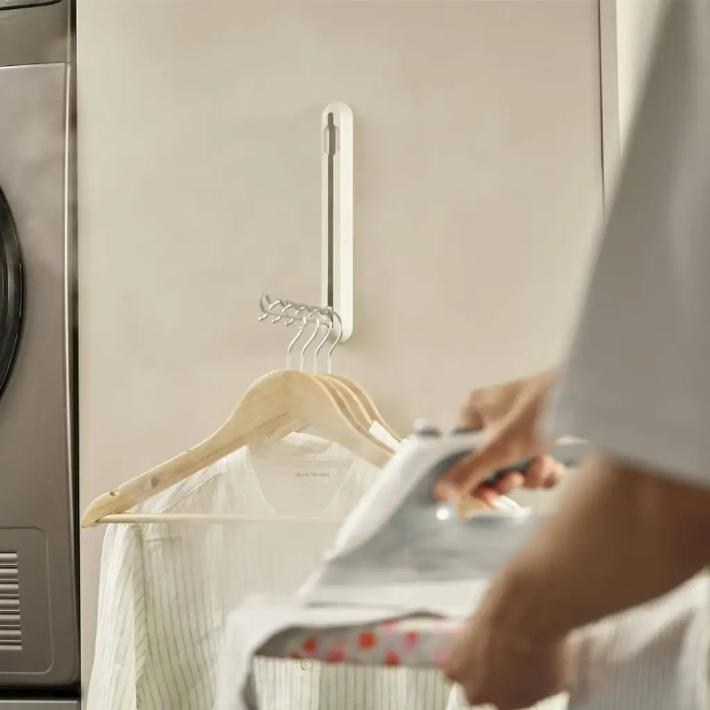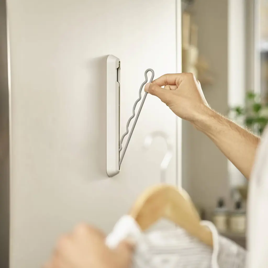 This handy clothes rail can be mounted on the wall or a door to create temporary hanging space anywhere in the home and is ideal for when drying or ironing clothes. Easy to install and supplied with screws and wall plugs, the rail has space for up to five standard coat hangers and folds neatly away after use. Perfect for bedrooms, bathrooms and utility rooms.
