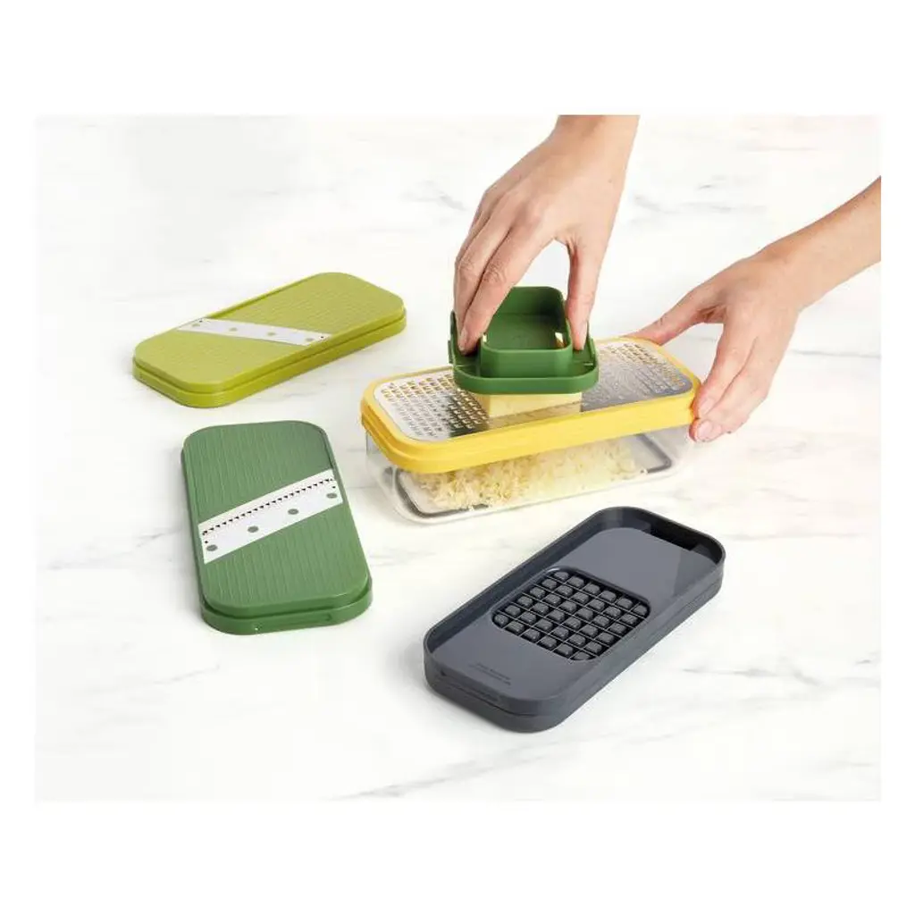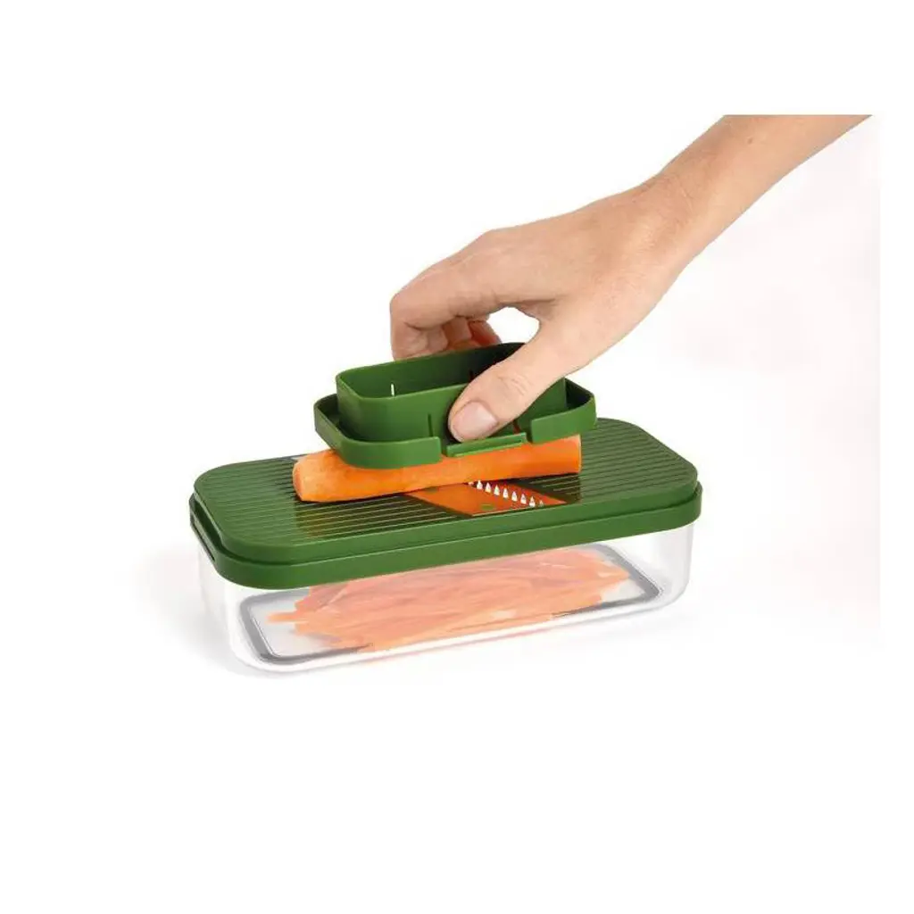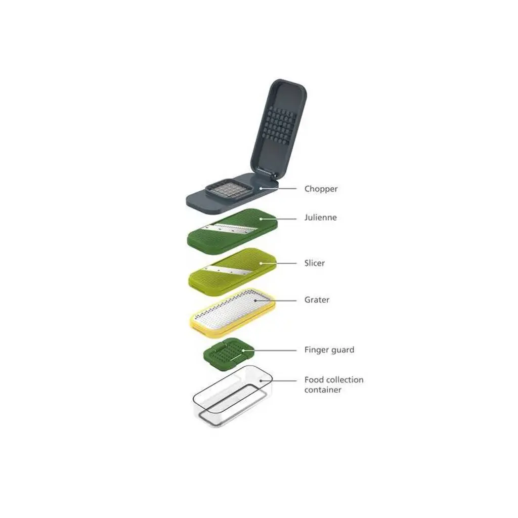 Food prep has never been easier - or neater - than with this handy, all-in-one gadget. It features a clear collecting base with four interchangeable tools that fit neatly on top, allowing you to catch prepped food as you go. The set includes a chopping blade, a slicing blade, a grating blade and a Julienne blade that are all made from stainless steel. There's also a finger guard for safety, which clips under the grater when not in use. Simply fit the tool you need to the top of the container and away you go. When finished, the four tools stack neatly together on top of the base for space-saving storage.