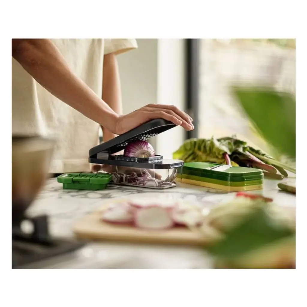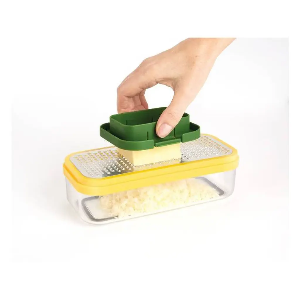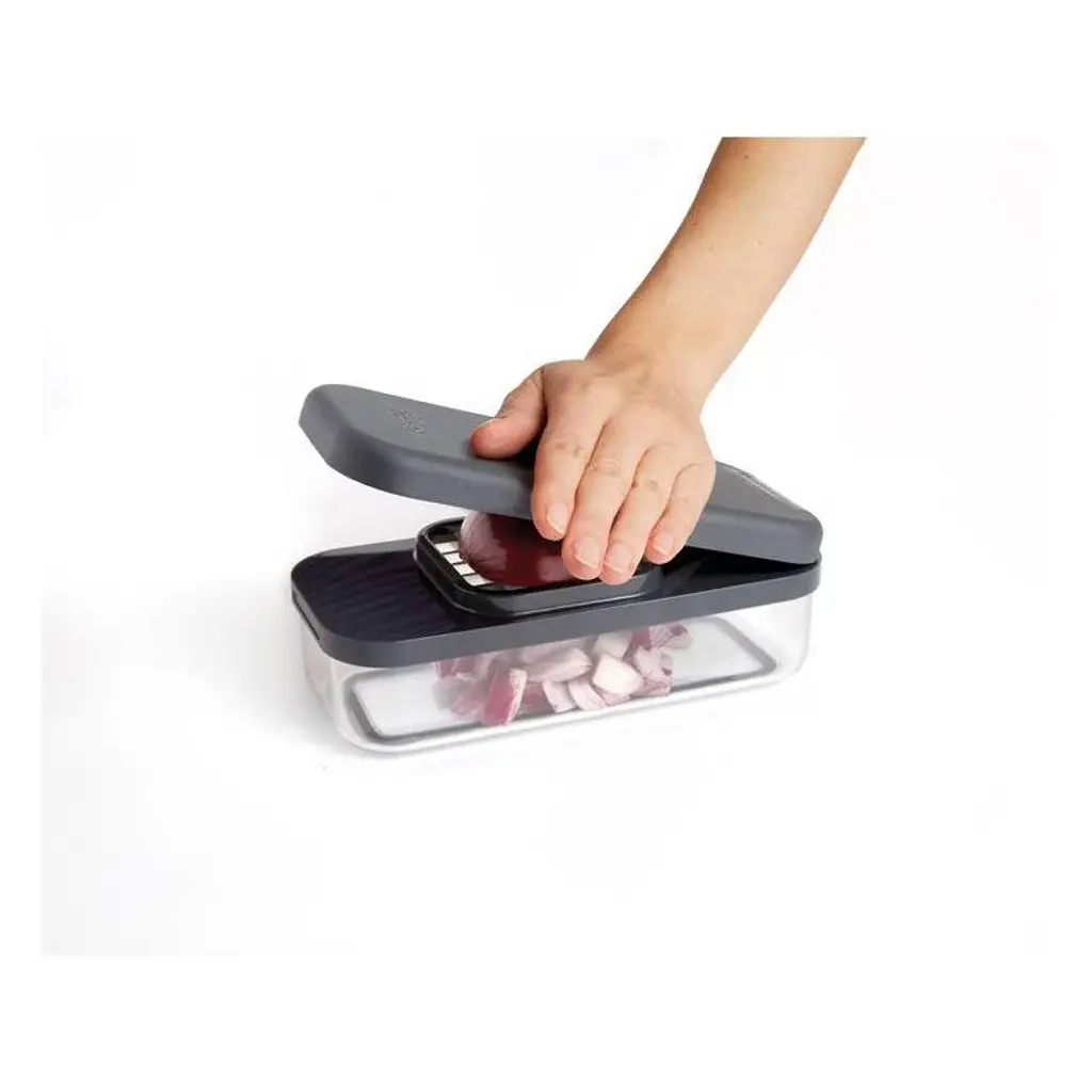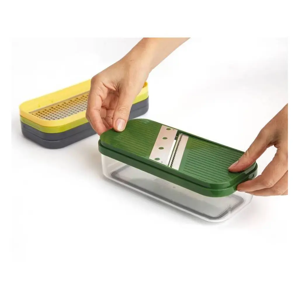 Food prep has never been easier - or neater - than with this handy, all-in-one gadget. It features a clear collecting base with four interchangeable tools that fit neatly on top, allowing you to catch prepped food as you go. The set includes a chopping blade, a slicing blade, a grating blade and a Julienne blade that are all made from stainless steel. There's also a finger guard for safety, which clips under the grater when not in use. Simply fit the tool you need to the top of the container and away you go. When finished, the four tools stack neatly together on top of the base for space-saving storage.
