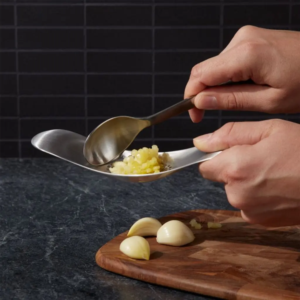 This compact tool makes quick work of cloves of fresh garlic, keeping your hands free of garlic smell and stickiness. The gracefully curved stainless steel rocker is sturdy, allowing downward force and a relaxed rocking motion to effortlessly crush garlic. After being pressed through the perforations, garlic gathers in the rocker, allowing you to crushing cloves until you have just the right amount. Scrape the pieces directly into your pan, then rinse or place in the dishwasher for easy clean up.View all Joseph Joseph products