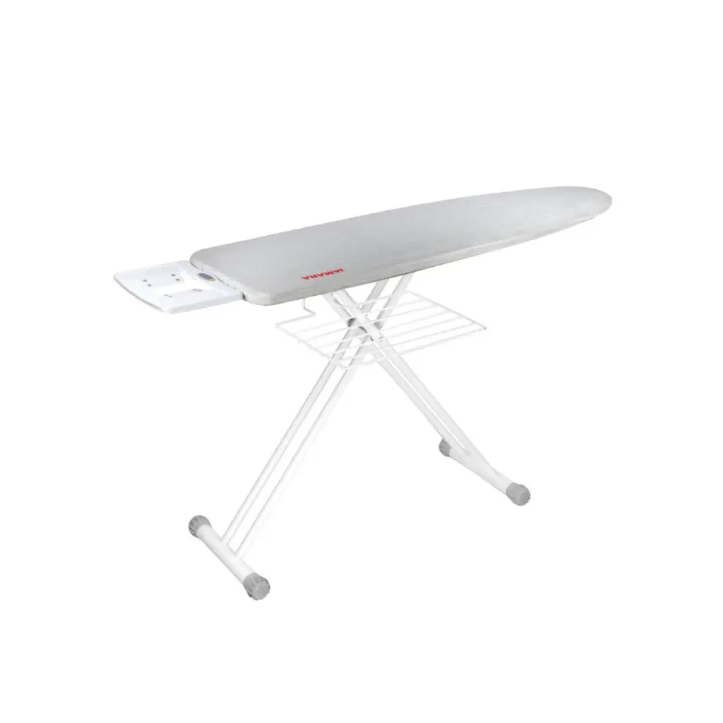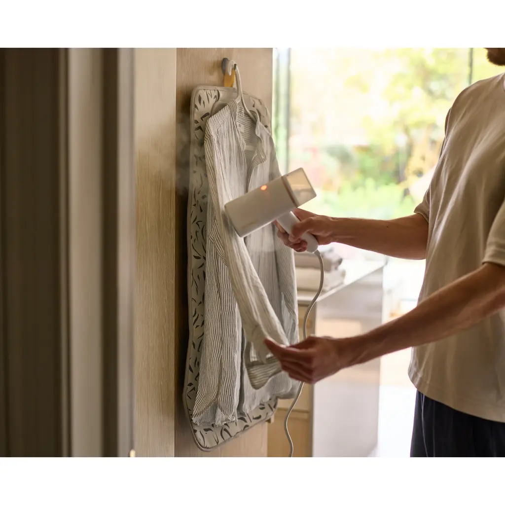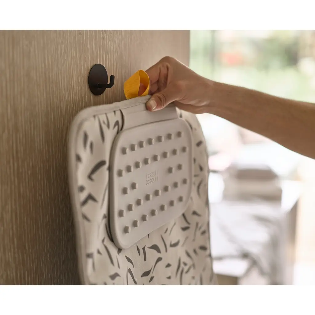 Struggling for ironing space? This handy ironing mat allows you to quickly set up to iron on any flat surface, such as a table or counter. The mat is heat and steam-resistant using multi-layer DripLock technology. This features a high-quality cotton top layer with an extra thick padded underlay, a waterproof layer and finally a trusty non-slip layer. When you need to place down your iron, there's a fold-out silicone iron rest providing a safe place for it to stand. It also has a hanging loop for when steaming garments against a door or wall - you can also store it this way, or just fold it up and secure it with the elastic straps for compact storage.