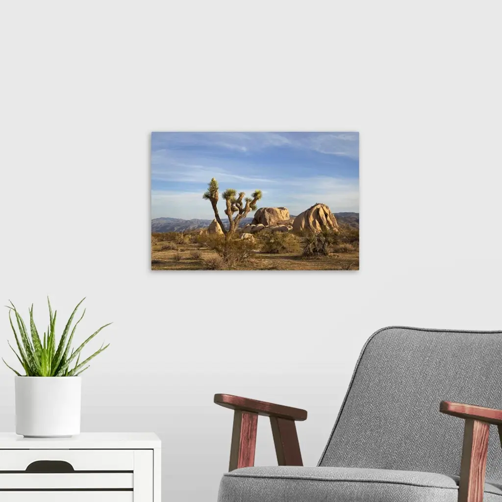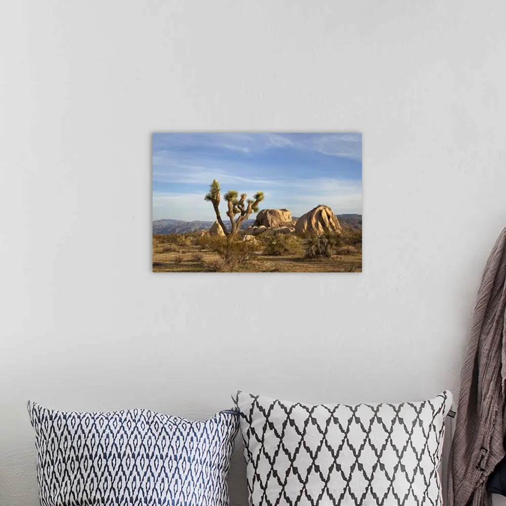 A daytime view of a Joshua Tree and boulders in Joshua Tree National Park