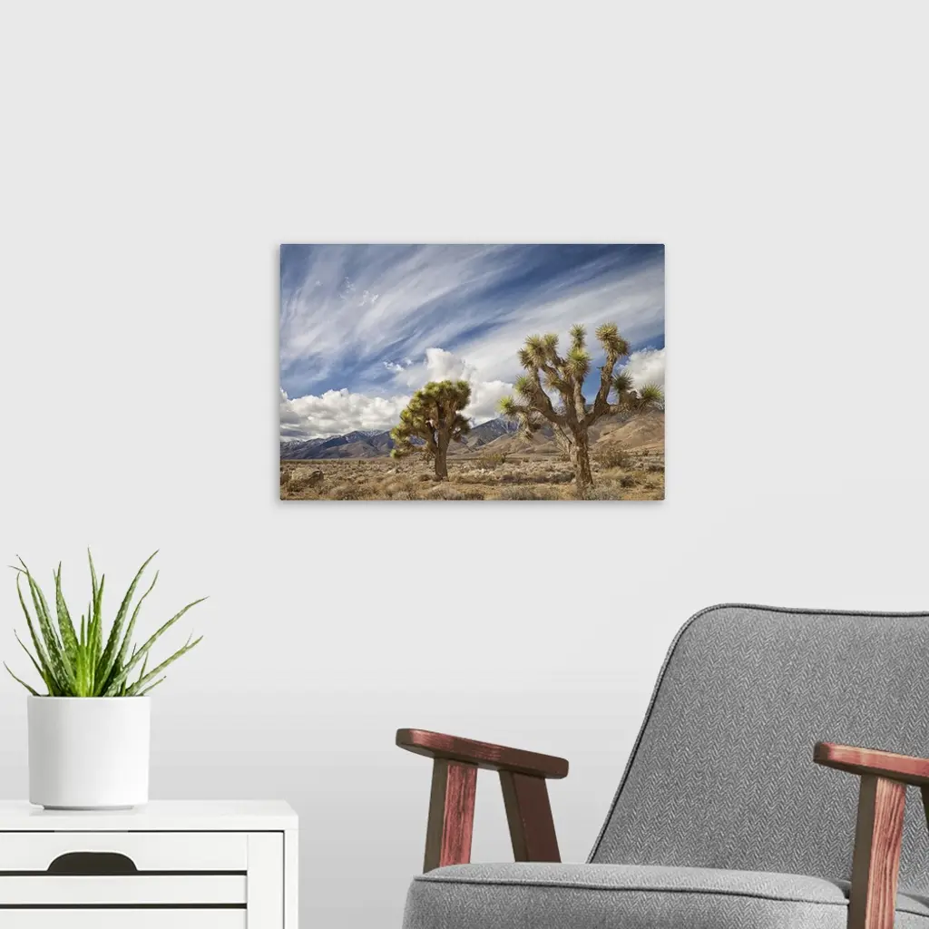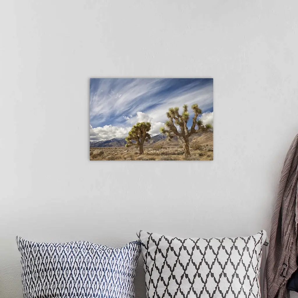 Two Joshua Trees in desert, with clouds over mountains in Eastern Sierra, Owens Valley, CA.