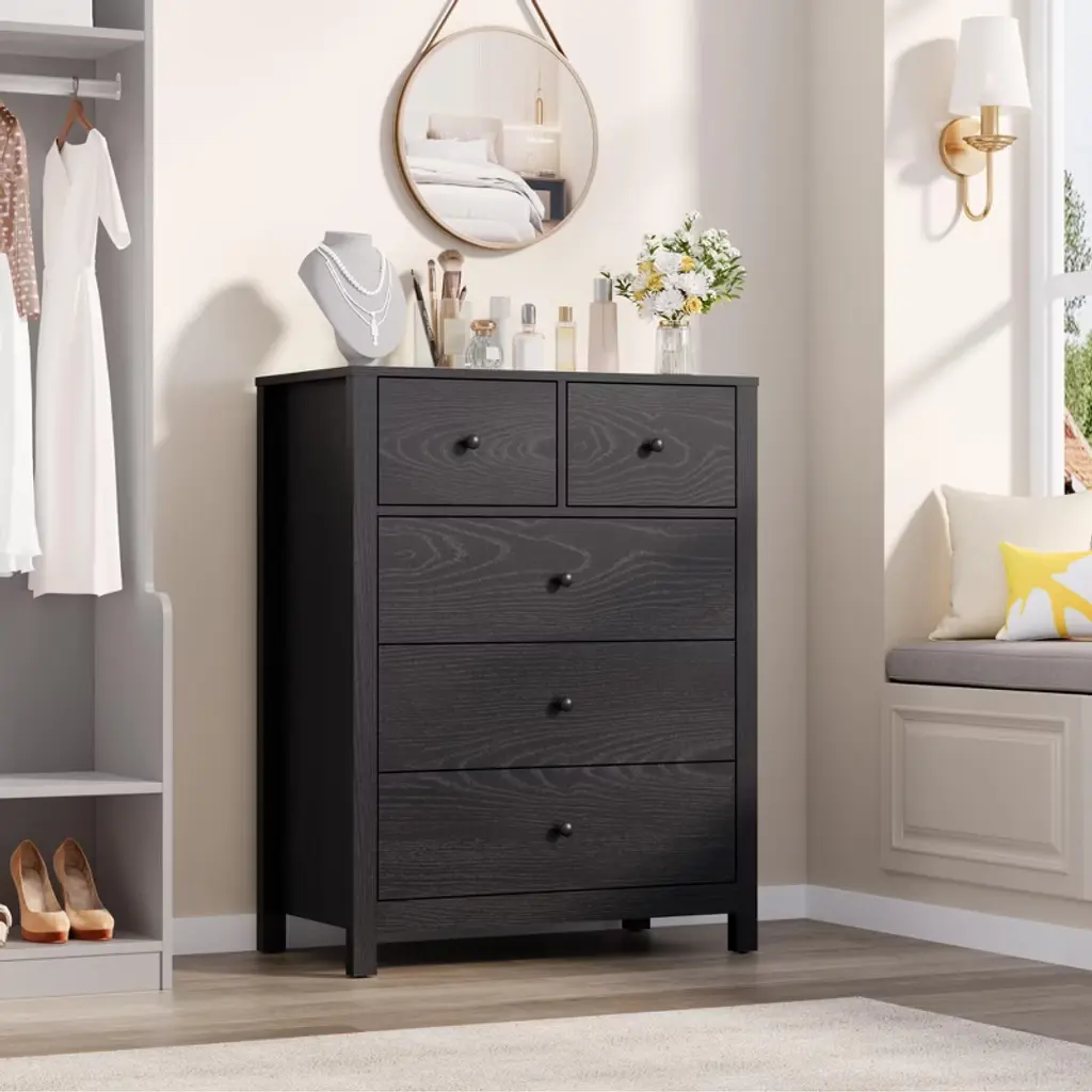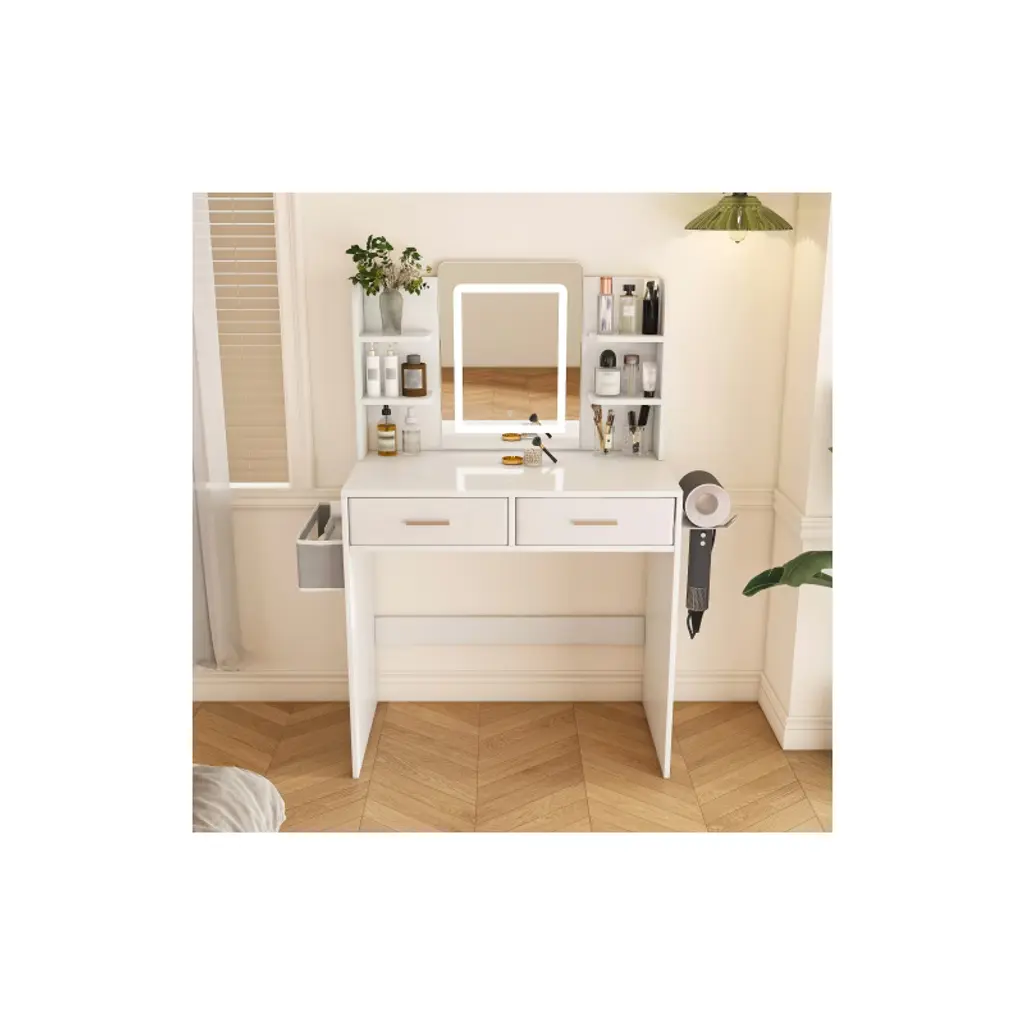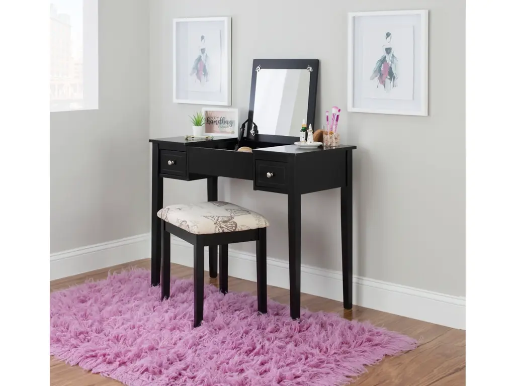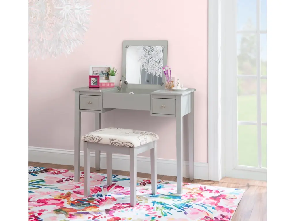 Modern classic vanity that curates a neat and tidy getting-ready space. Features a mirror, two slim drawers with roller glides and two open shelves for holding cosmetics, skin care and more. Assembly required.