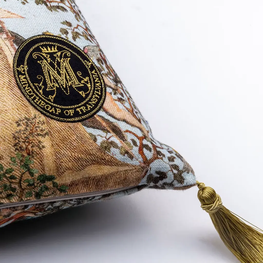 A fabulous Renaissance style design features hand coloured engravings of angels and gods in a imaginary travel to Eden. Made of stonewashed linen, the cushion is finished with burnt gold tassels and comes with 100% duck feathers filing.