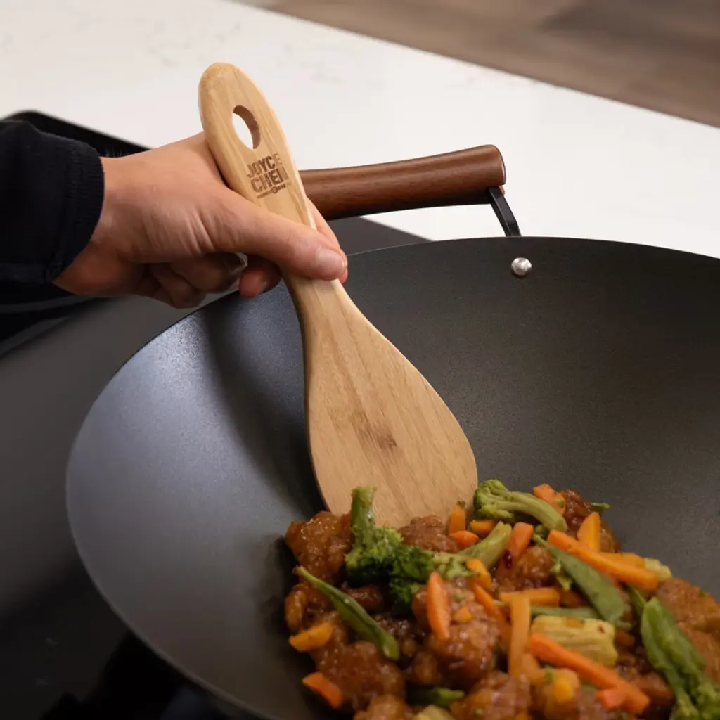 Joyce Chen was passionate about cooking healthy and delicious meals, and making Asian cooking accessible to every household; forever enriching the cuisine, culture, and curiosity of culinary experts and enthusiasts alike. JOYCE CHEN® Kitchenware is inspired by her legacy and offers a complete range of products that help you craft authentic Asian dishes in your own kitchen and bring delicious new flavors to your table. The Joyce Chen 3-Piece Burnished Bamboo Wok Utensil Stir Fry Set is the ultimate set of wok utensils for anyone who loves making Asian cuisine at home. This eco-friendly bamboo utensil set includes a rice paddle, mixing spoon, and stir fry spatula. The mixing spoon can mix up ingredients in a bowl, pan or wok, the rice paddle deftly scoops and serves rice, and the stir fry spatula is specifically designed to hug the rounded sides of a wok. This bamboo utensil set is an eco-friendly choice made from a sustainable resource with a burnished finish that protects against heat and moisture.The material is also gentle on nonstick and seasoned cookware to prevent scratches. Whether you’re a seasoned home-chef, or just starting to cook, the Joyce Chen 3-Piece Burnished Bamboo Wok Utensil Stir Fry Set makes the perfect addition to your essential kitchen utensils.