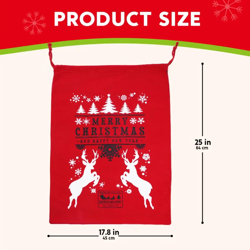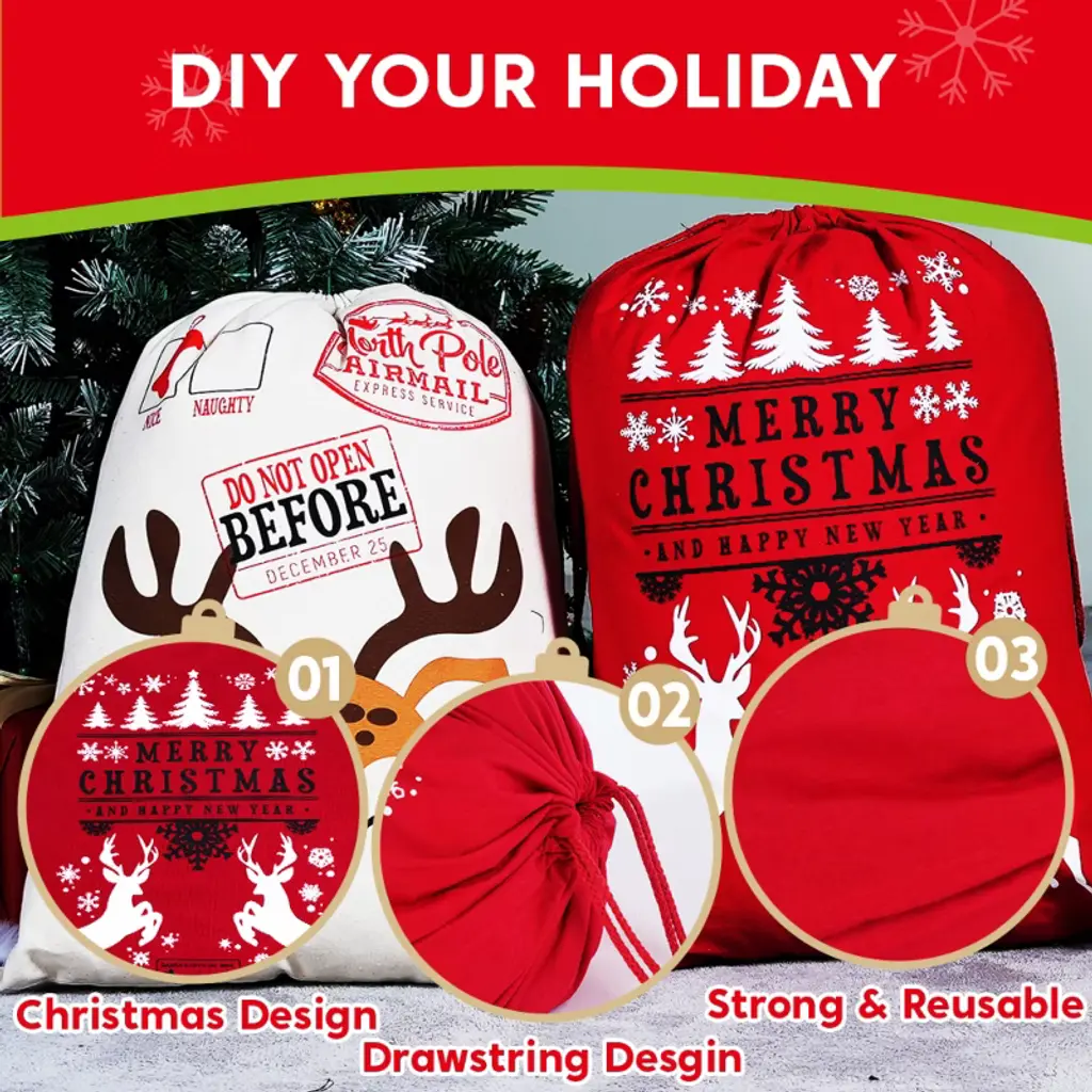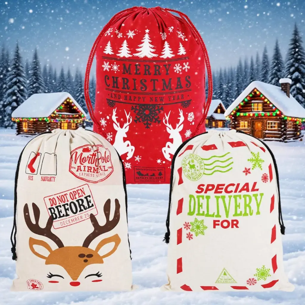 Our jumbo 3-pack Christmas Santa sacks make holiday gifting easier and more festive than ever! Each 26"x19" burlap gift bag features charming designs with a special writable space for names or holiday wishes, adding that extra personal touch to every present. Perfect for stuffing with toys, treats, or surprises, these durable drawstring sacks save you time on wrapping while creating that picture-perfect Christmas morning moment. Use them as holiday decor under the tree, for classroom gift exchanges, or even as festive party favor bags—they’re as versatile as they are merry! Made from heavy-duty, non-toxic materials, these sacks are built to handle Santa’s heaviest deliveries while keeping safety in mind. Whether you’re playing Santa’s helper or hosting a holiday party, these reusable sacks bring Christmas cheer to every celebration.🎄✨