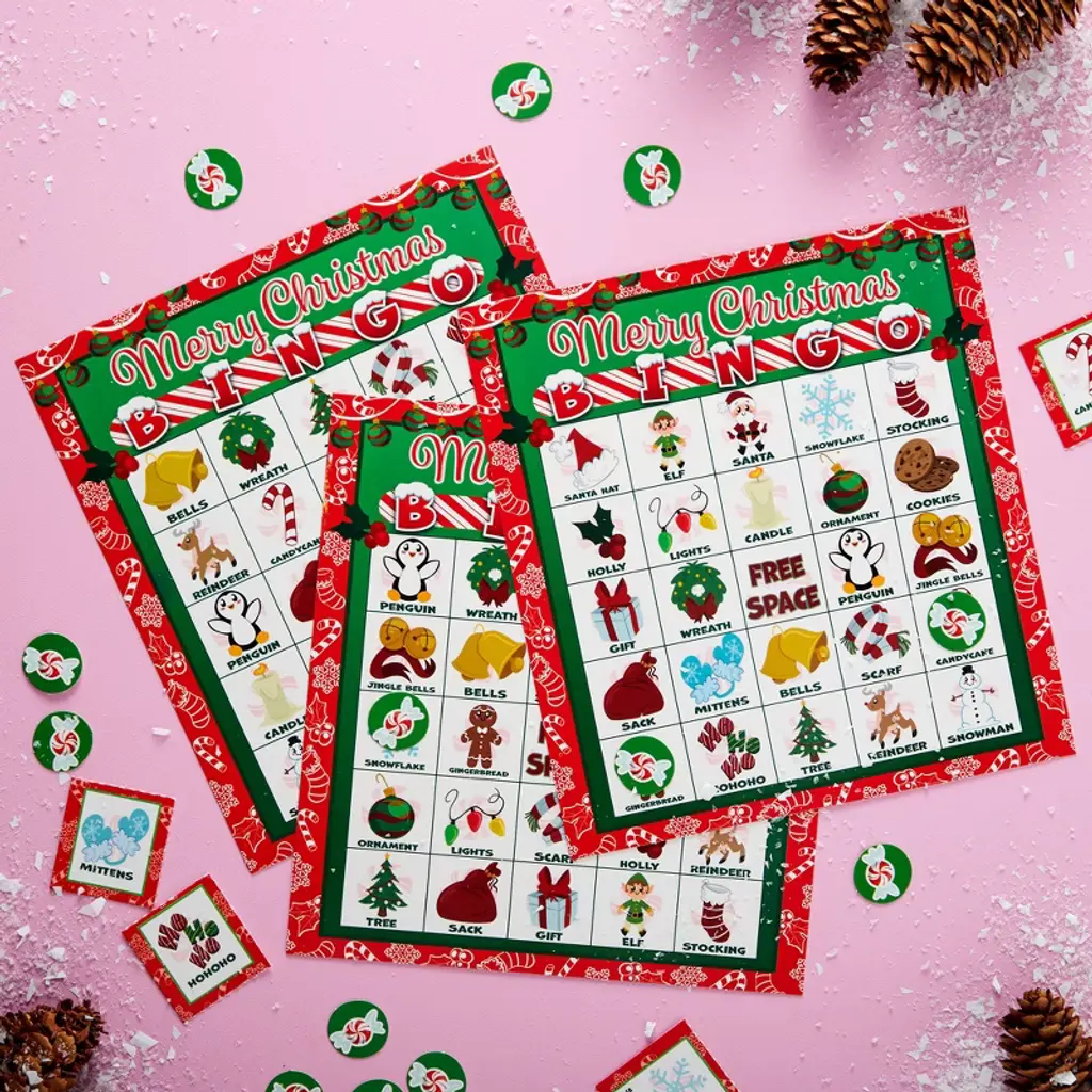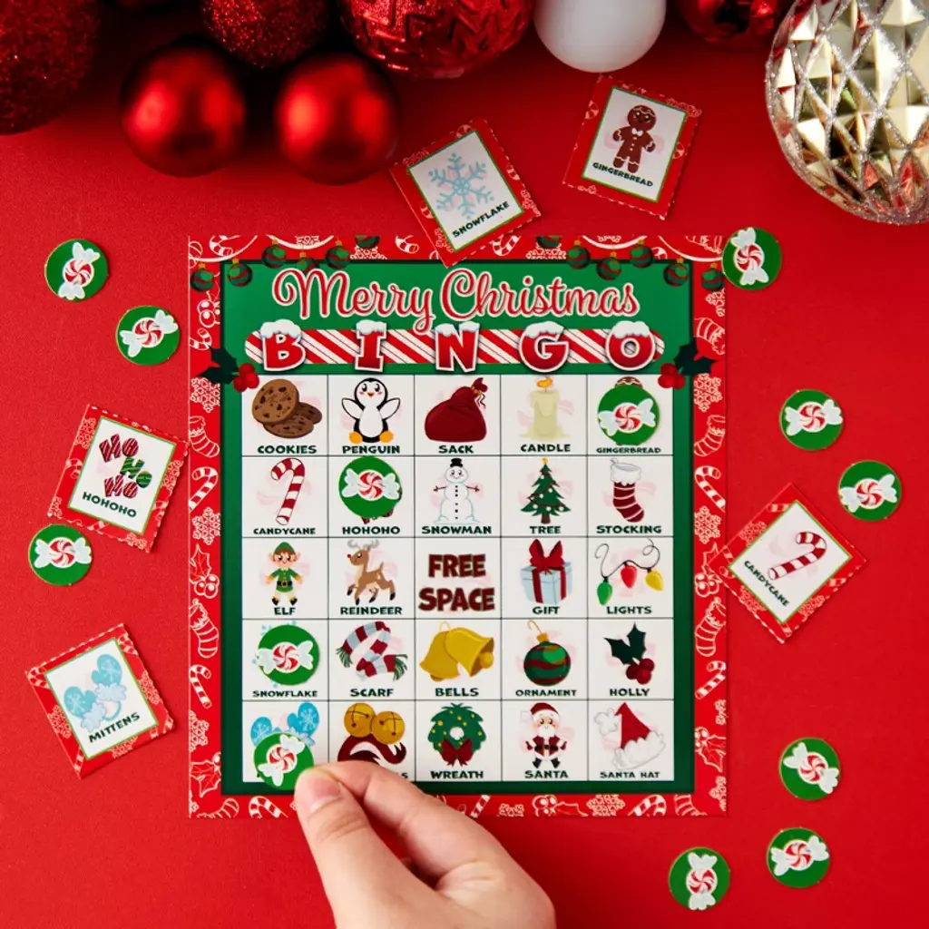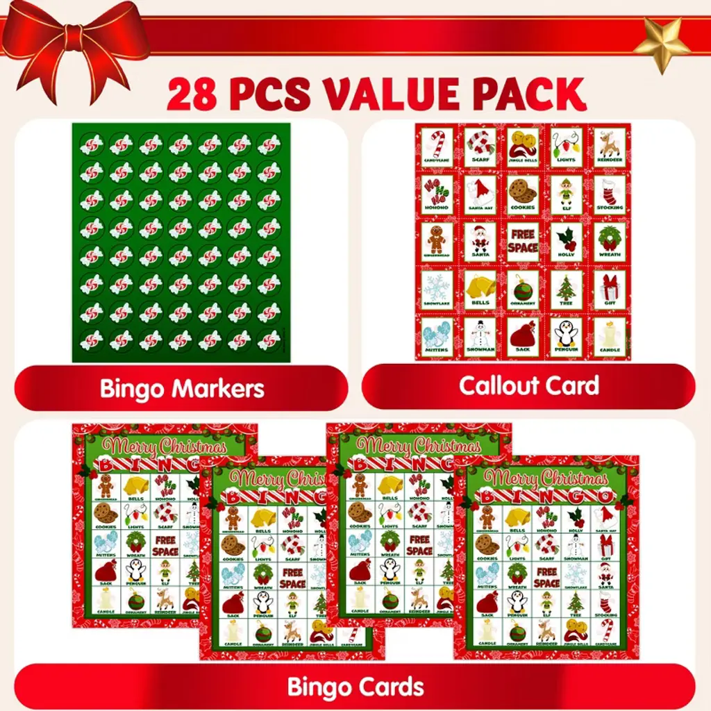 **🌟 Deck the Halls with Bingo Calls! Turn holiday gatherings into festive game nights with this 30-player Christmas Bingo set! Perfect for kids, families, and classrooms, this complete kit includes: ✔ 30 Unique Bingo Cards (No duplicates – everyone gets a fresh board!) ✔ 1 Call-Out Card (With 24 classic Christmas icons) ✔ 8 Marker Sheets (For endless rounds of play) 📜 How to Play: 1️⃣ Hand out bingo cards. 2️⃣ Call out holiday images (e.g., “Jingle Bells!”). 3️⃣ Mark matches – first to 5 in a row shouts “BINGO!”