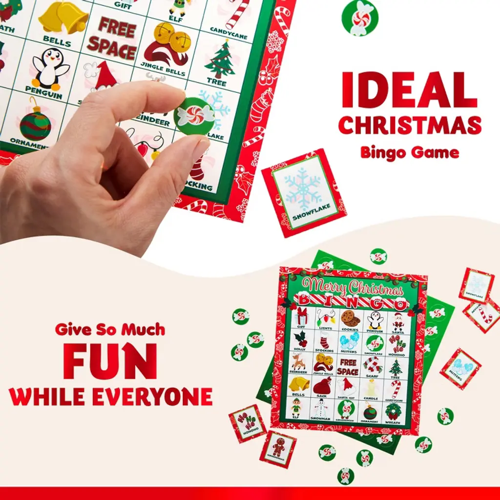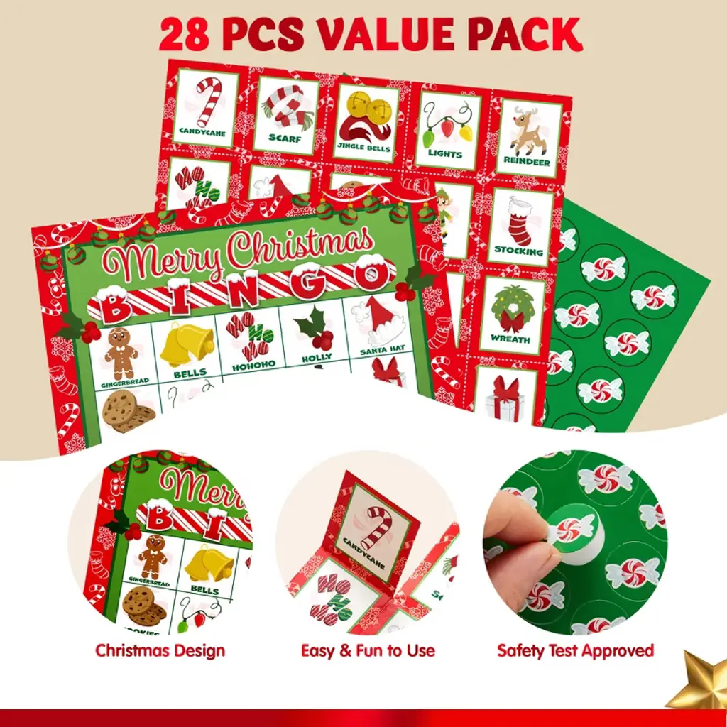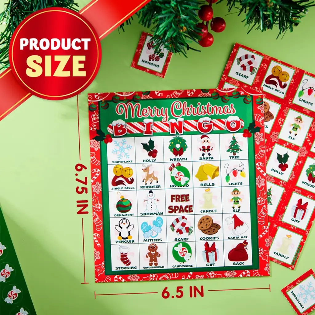 **🌟 Deck the Halls with Bingo Calls! Turn holiday gatherings into festive game nights with this 30-player Christmas Bingo set! Perfect for kids, families, and classrooms, this complete kit includes: ✔ 30 Unique Bingo Cards (No duplicates – everyone gets a fresh board!) ✔ 1 Call-Out Card (With 24 classic Christmas icons) ✔ 8 Marker Sheets (For endless rounds of play) 📜 How to Play: 1️⃣ Hand out bingo cards. 2️⃣ Call out holiday images (e.g., “Jingle Bells!”). 3️⃣ Mark matches – first to 5 in a row shouts “BINGO!”