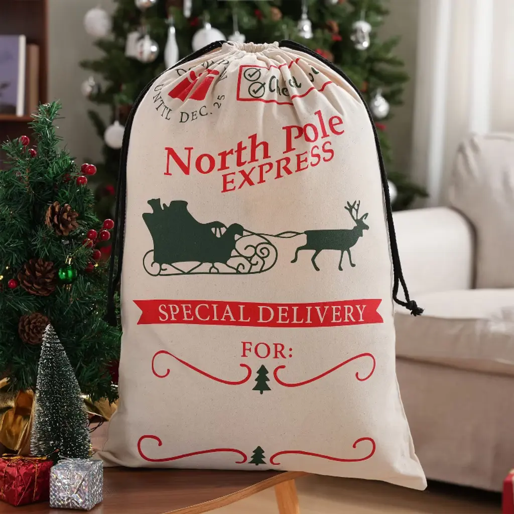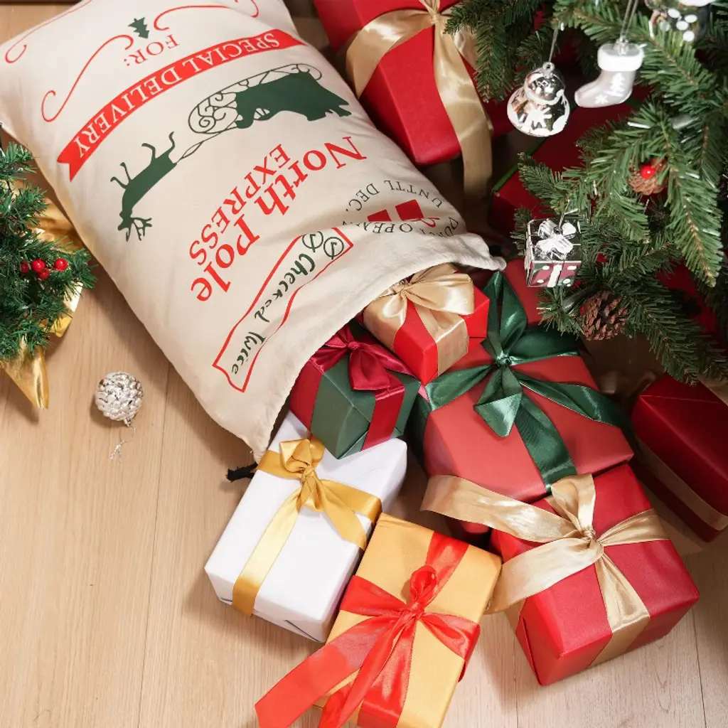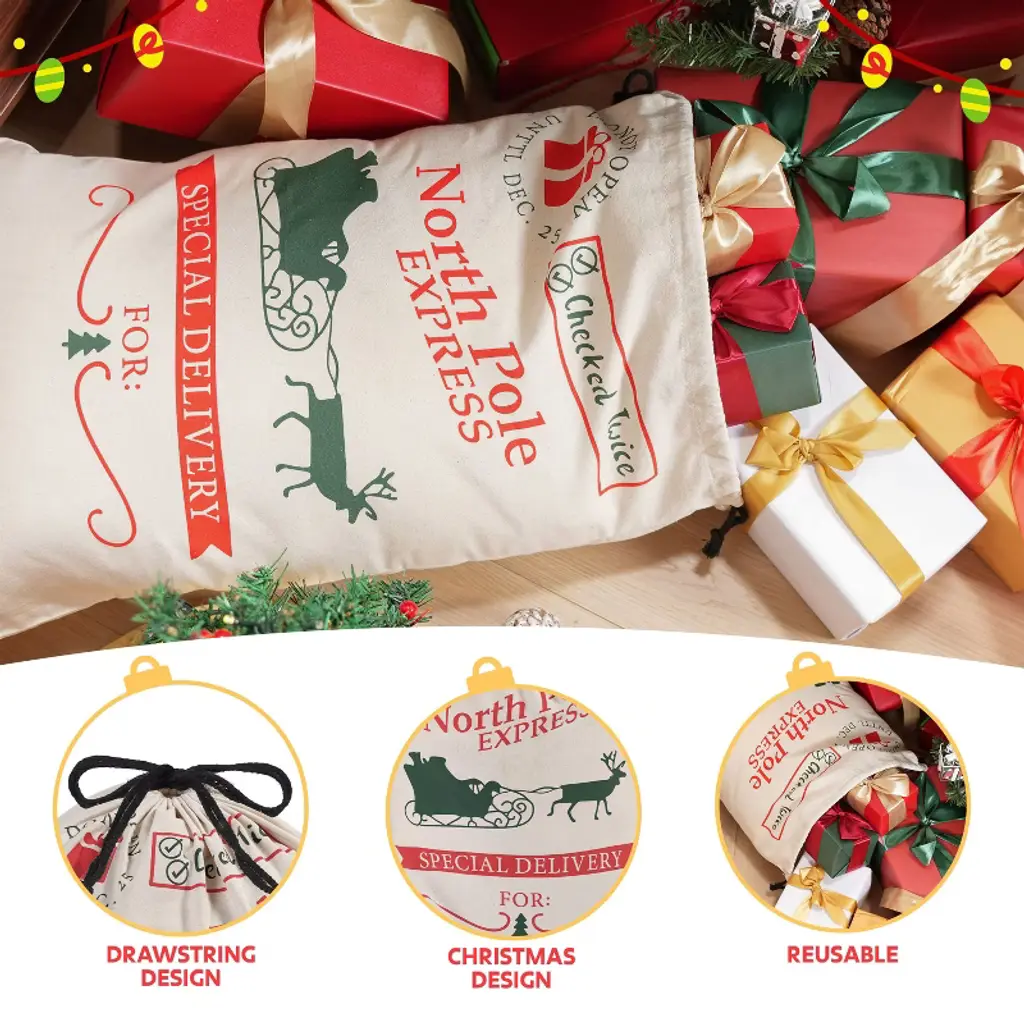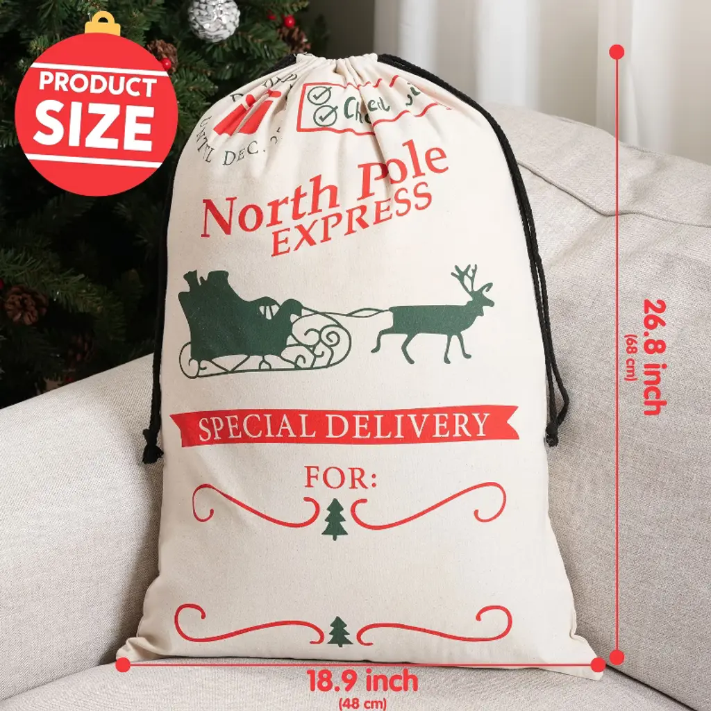 With a size of 26" x 19", this bag offers ample space for Christmas presents, which is large enough to hold gifts for a family. Making it ideal for wrapping and gifting. Elevate your christmas presenting with this burlap gift bag, perfect for large presents and personalized Santa sacks. The secure drawstring closure keeps surprises hidden until the big moment, while the writable surface lets you personalize each sack with names or holiday messages. We've made these sturdy reusable Christmas bags to last through countless holidays - just fold them flat and tuck away with your decorations. The non-toxic, heavy-duty material safely holds all your presents while being kind to the planet.🎅🎄