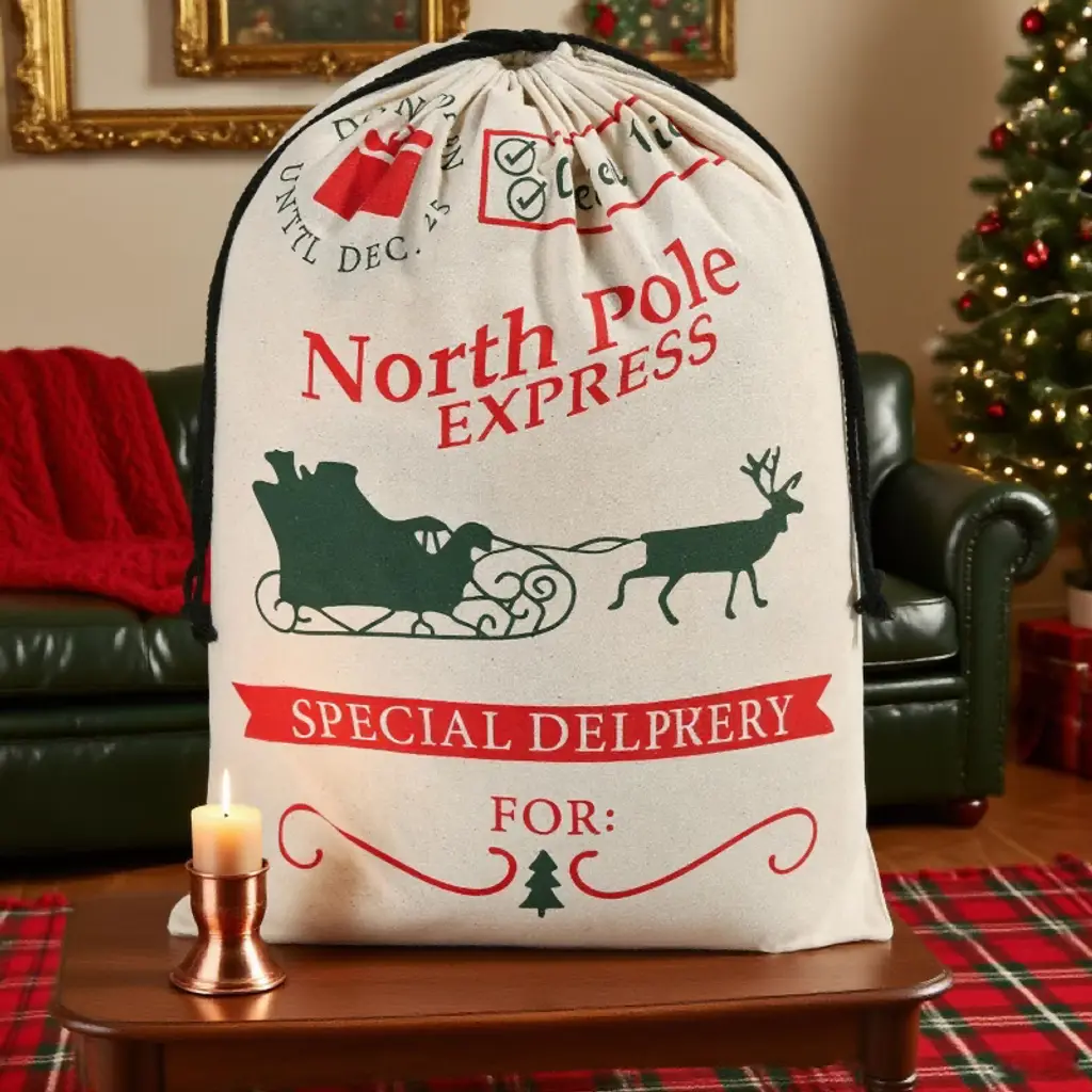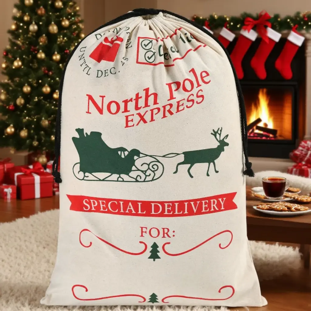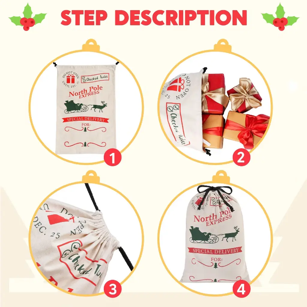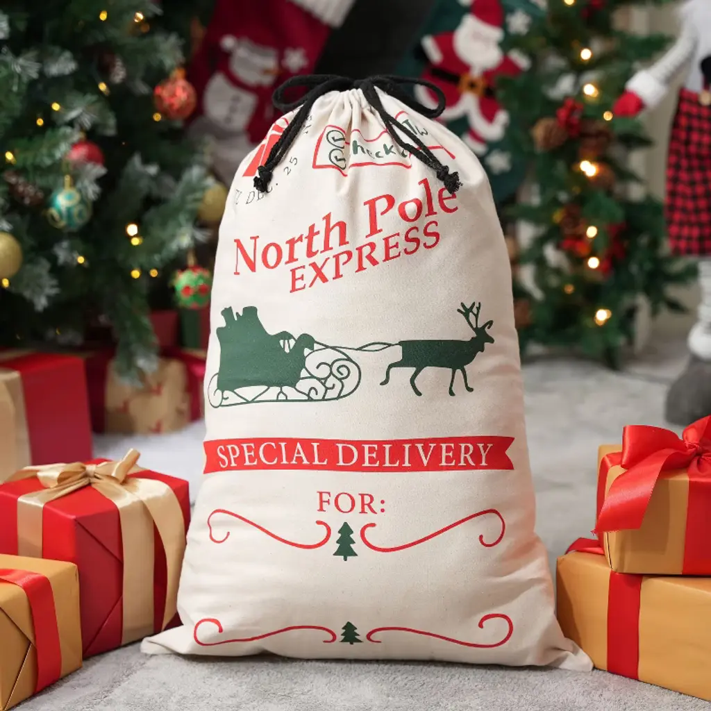 With a size of 26" x 19", this bag offers ample space for Christmas presents, which is large enough to hold gifts for a family. Making it ideal for wrapping and gifting. Elevate your christmas presenting with this burlap gift bag, perfect for large presents and personalized Santa sacks. The secure drawstring closure keeps surprises hidden until the big moment, while the writable surface lets you personalize each sack with names or holiday messages. We've made these sturdy reusable Christmas bags to last through countless holidays - just fold them flat and tuck away with your decorations. The non-toxic, heavy-duty material safely holds all your presents while being kind to the planet.🎅🎄