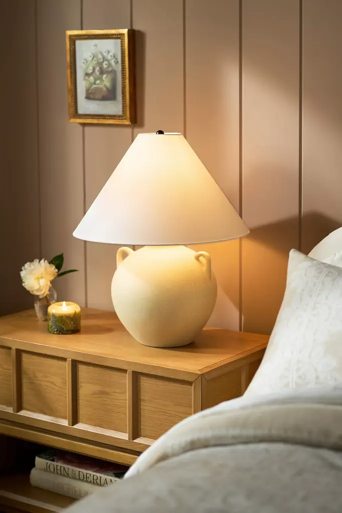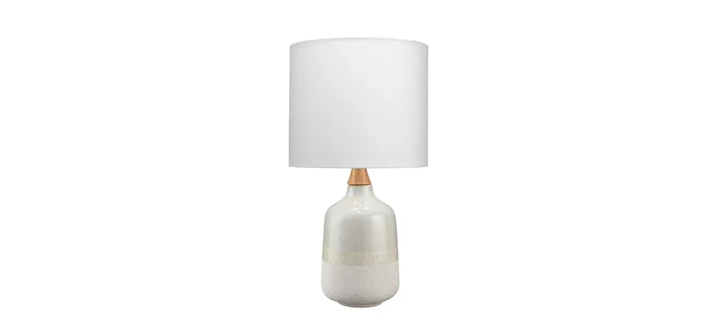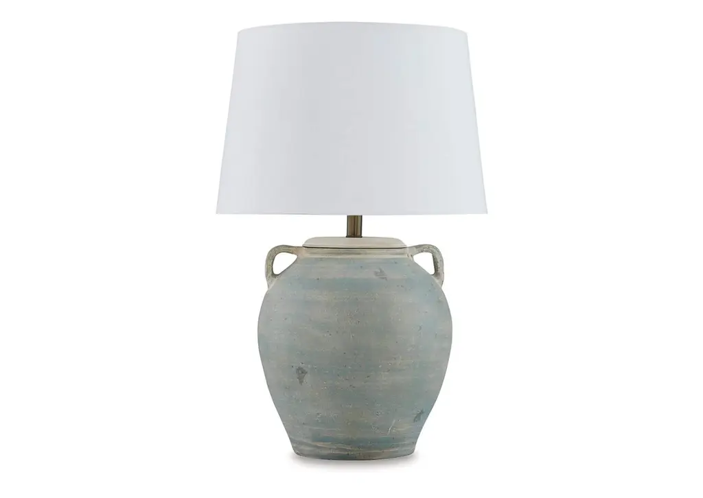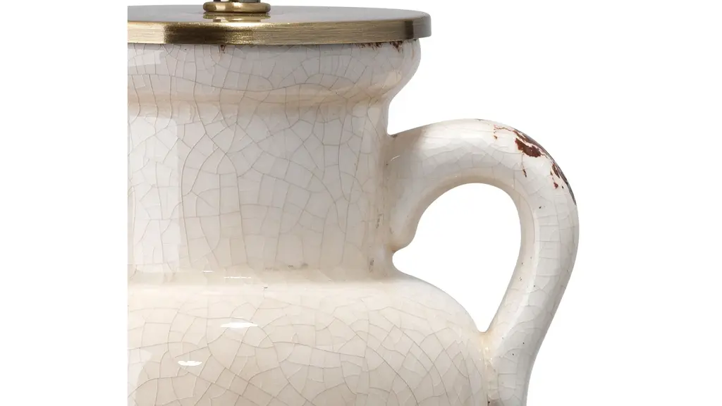 Expert antiquing lends this ceramic Jug Table Lamp the look of a vintage treasure. The base and coordinating ball finial are finished in cream, and the included cone shade is off white linen. Metal accents in antique brass contrast elegantly.