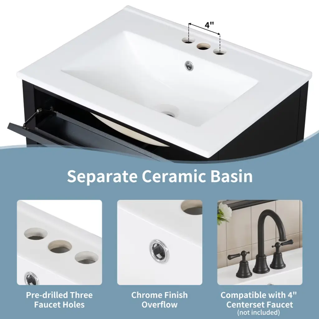 Jujabu 24" Modern Black Vanity With Sink, 3 Drawers & Adjustable Storage For Small Bathrooms