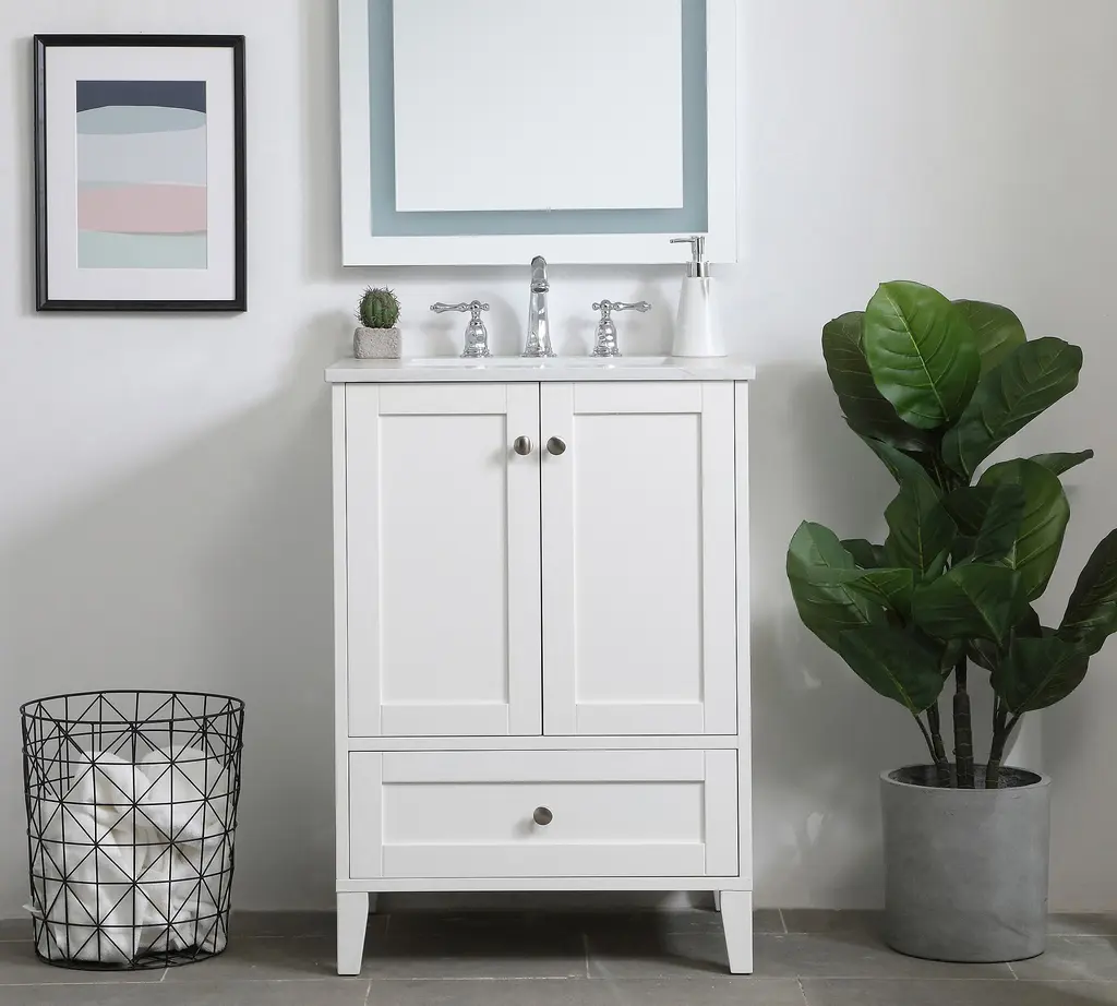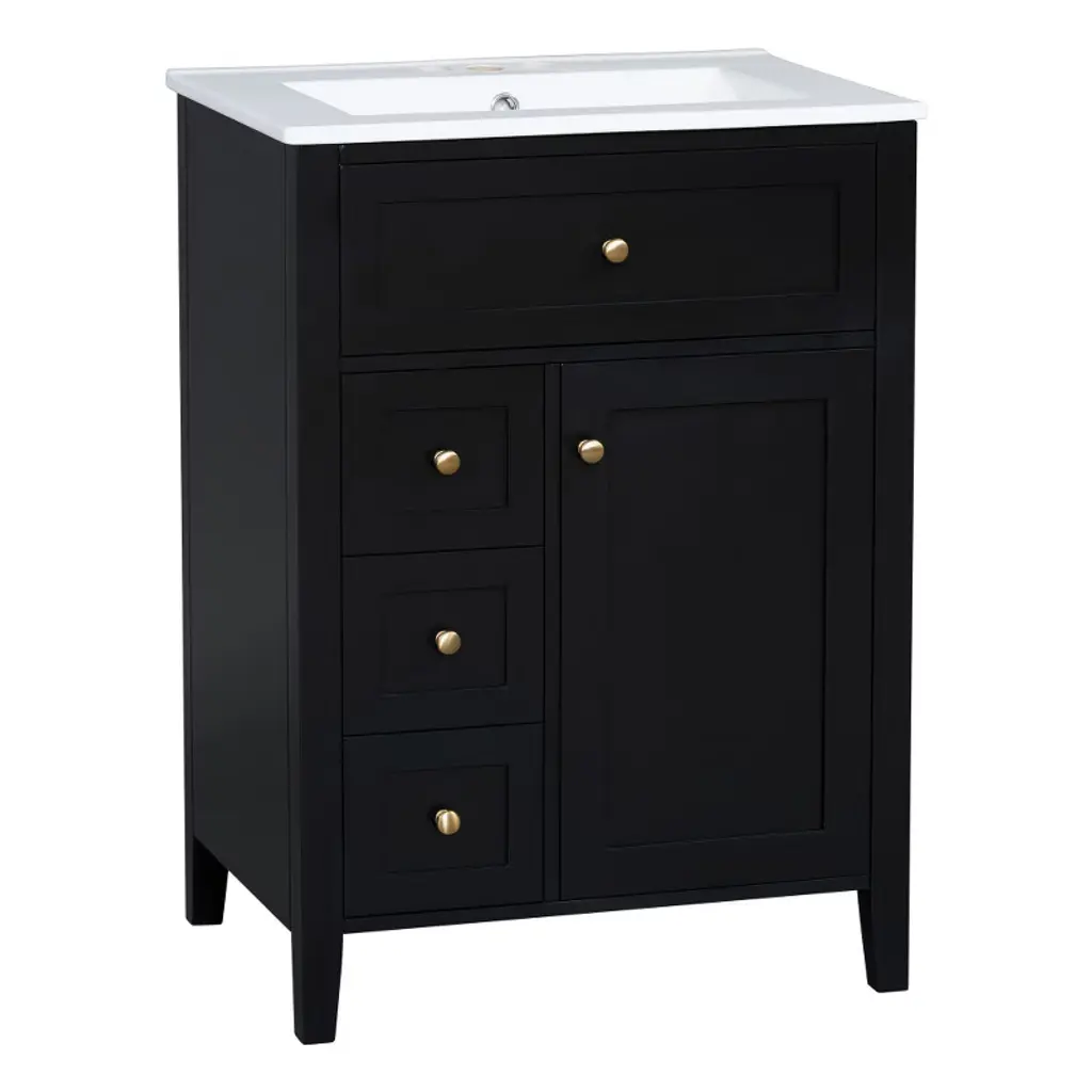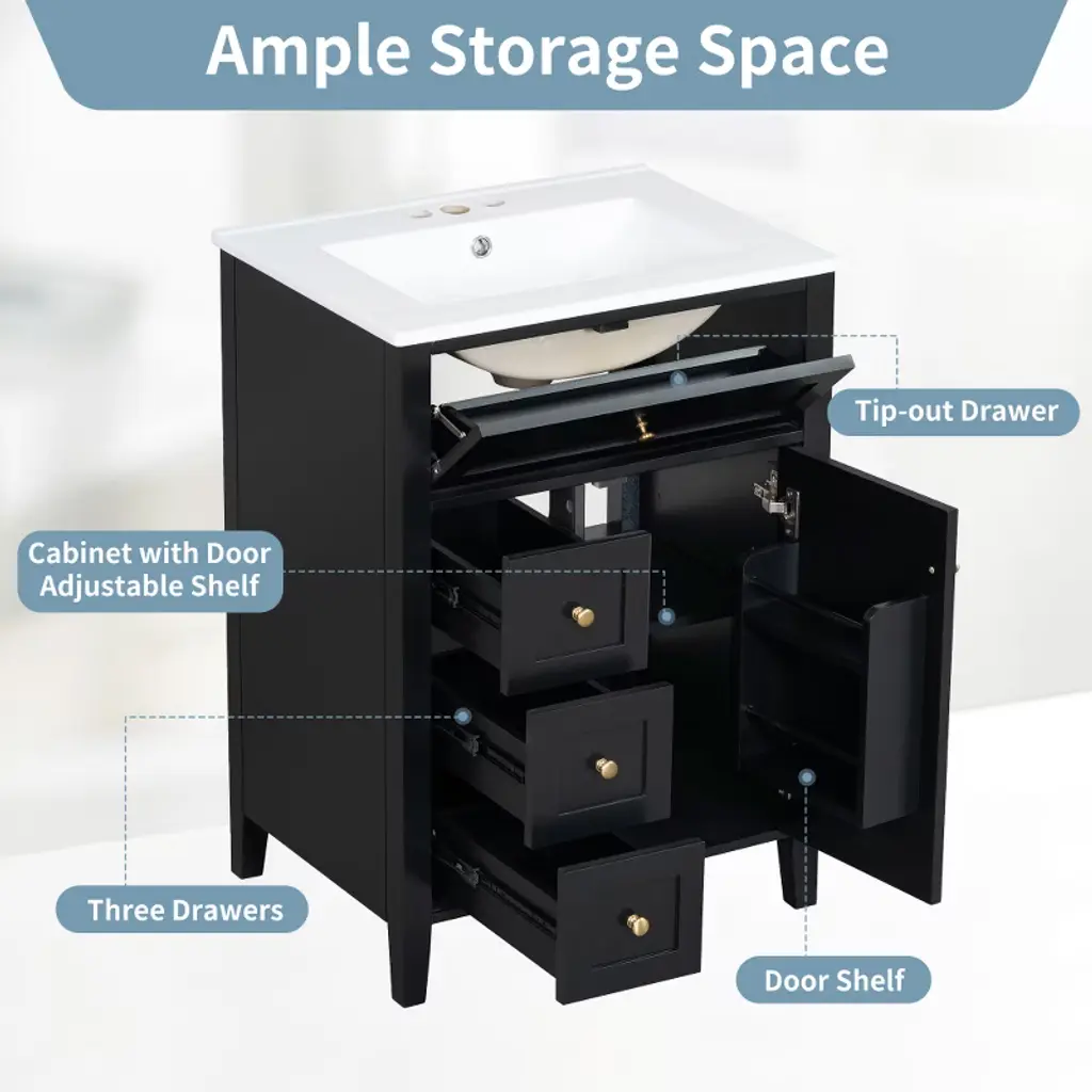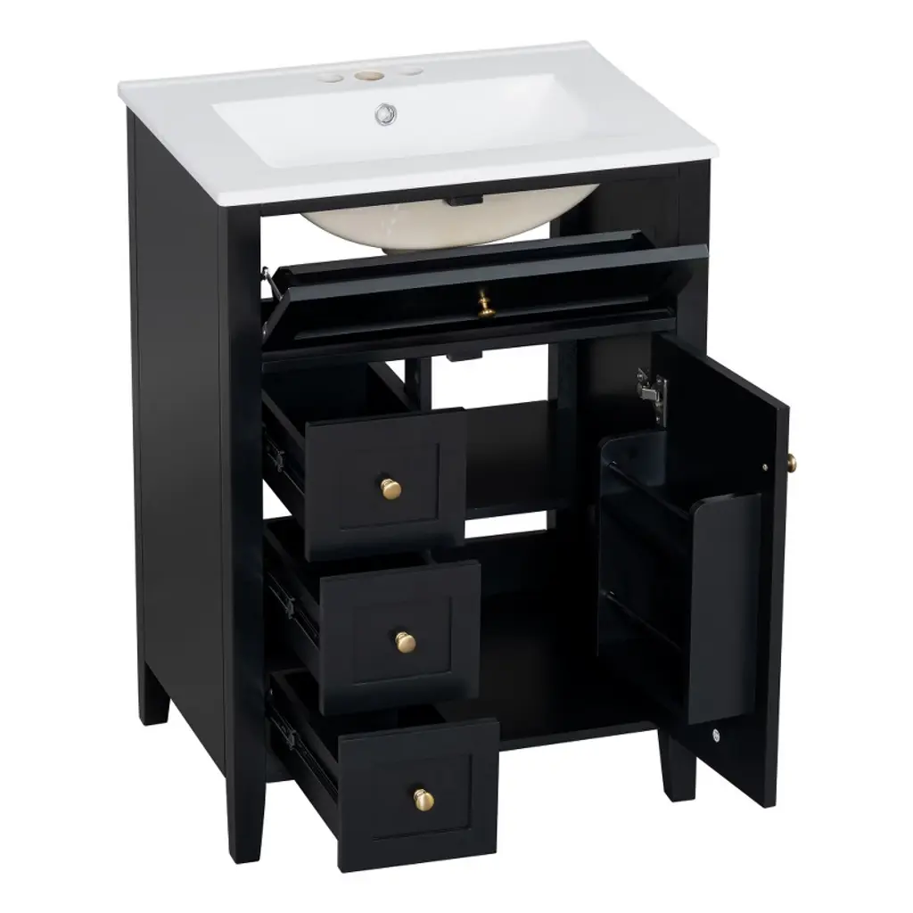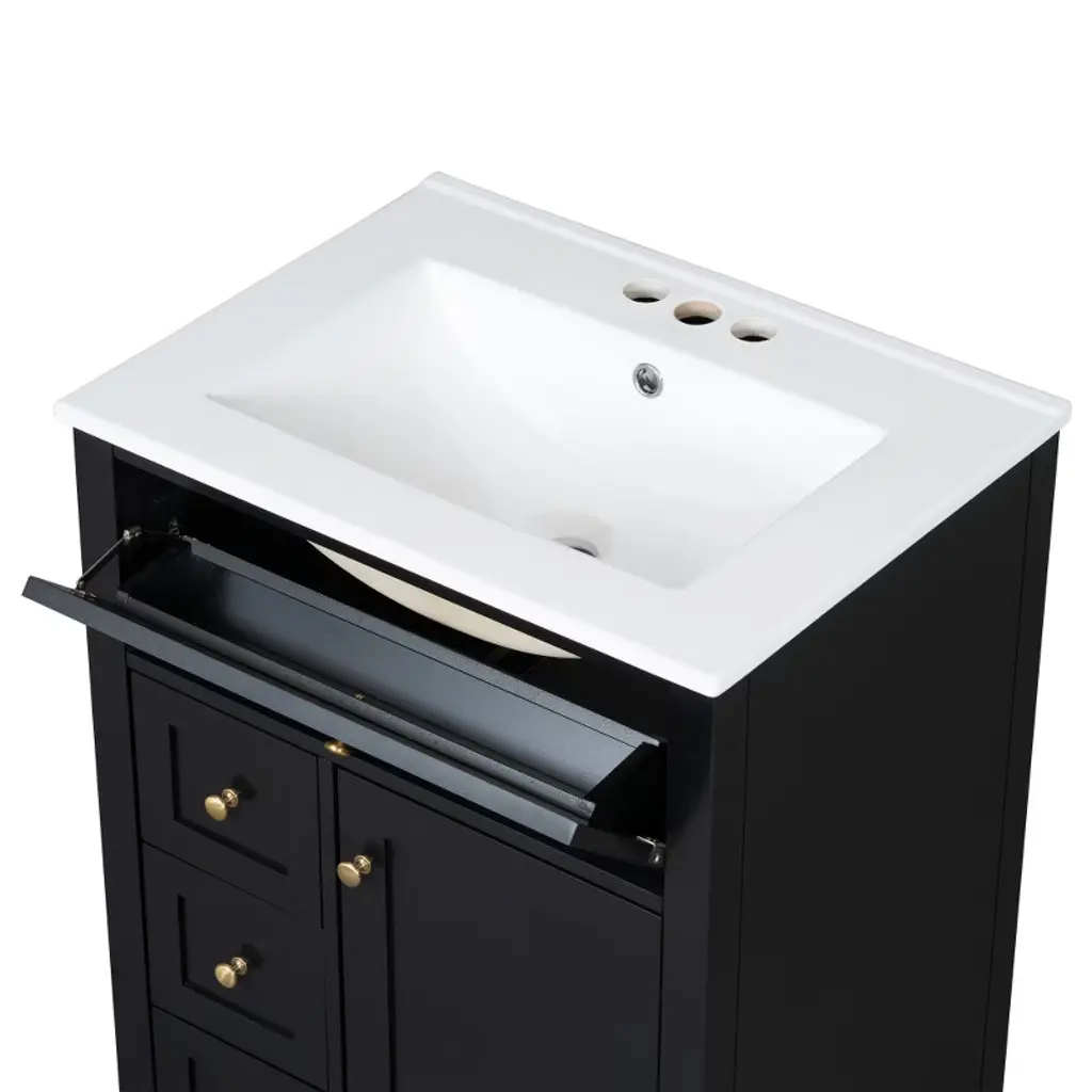 This sleek 24-inch bathroom vanity combines modern style with practical functionality, making it ideal for small to medium-sized spaces. Featuring a glossy black finish with elegant gold knobs, it offers three spacious drawers and a cabinet with adjustable shelves to keep your essentials organized. The durable construction of MDF and solid rubberwood ensures long-lasting stability and supports up to 150 lbs. Its compact footprint maximizes storage without overwhelming the room. A convenient pull-out top drawer provides quick access to frequently used items. Perfect for upgrading your bathroom with a clean, contemporary look.