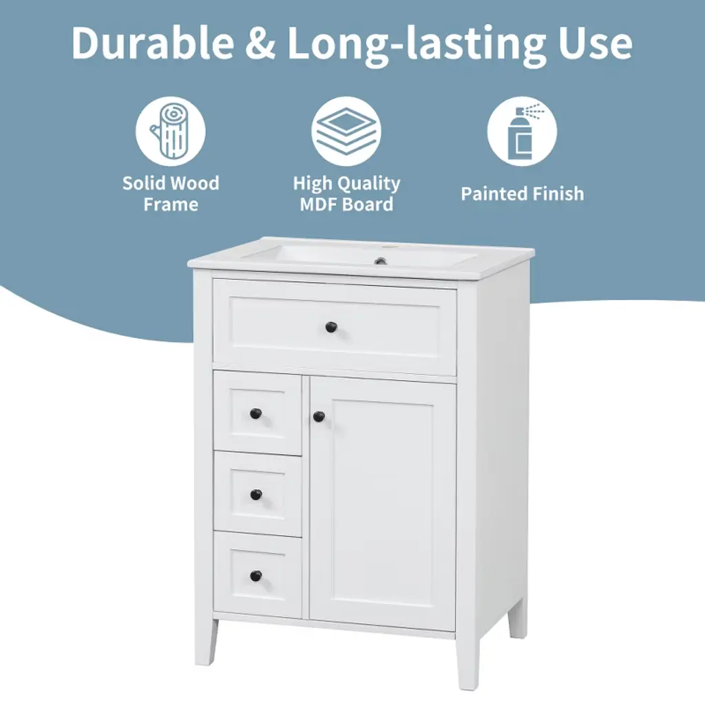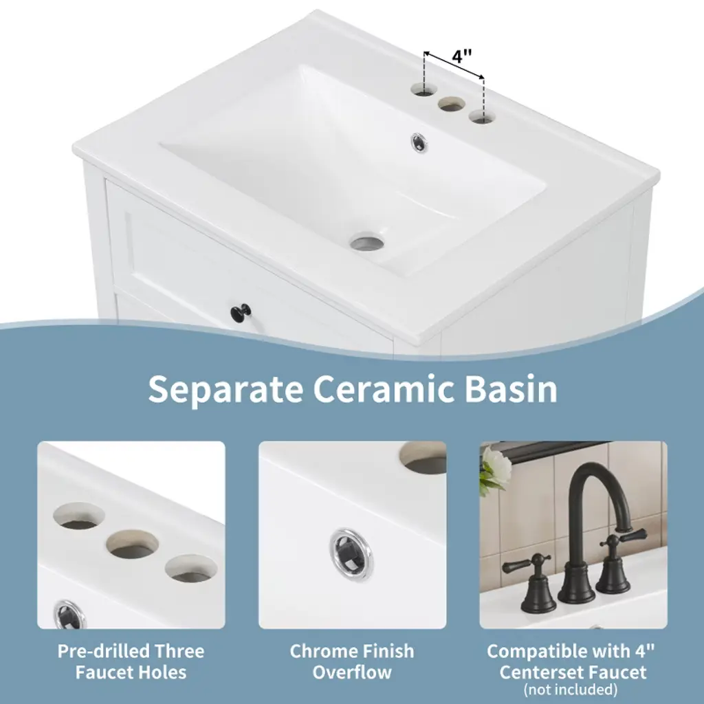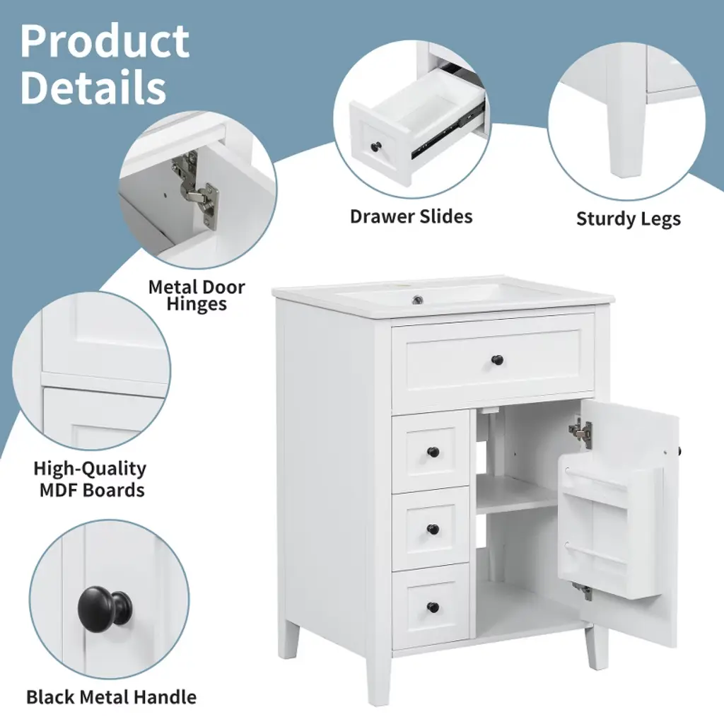 Jujabu 24" Modern White Vanity With Sink, 3 Drawers & Adjustable Storage For Small Bathrooms